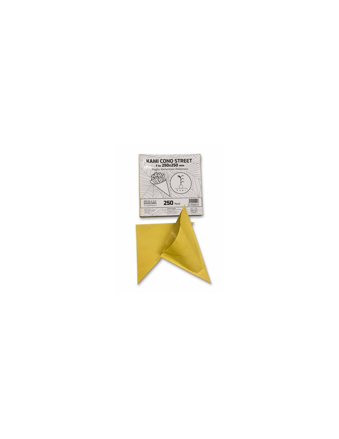 Pacchetti da 250 coni. Formato 25x25 cm, carta paglia alimentare da grammi 80 + 9 grammi di Politenata. Colore giallo.
