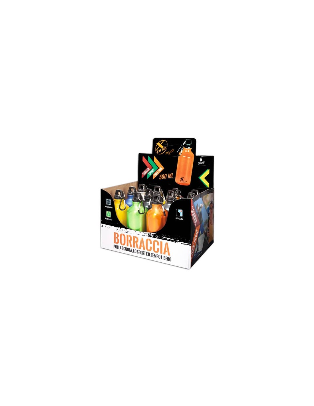 Borraccia in alluminio, 500 ml. Ideale per lo sport, la scuola ed il tempo libero. Cappuccio con moschettone. Pratica e leggera. Atossica, adatta per alimenti. Senza piombo o altre sostanze dannose. Riciclabile al 100%. Certificata. 6 colori assortiti. Display da 12 pezzi.