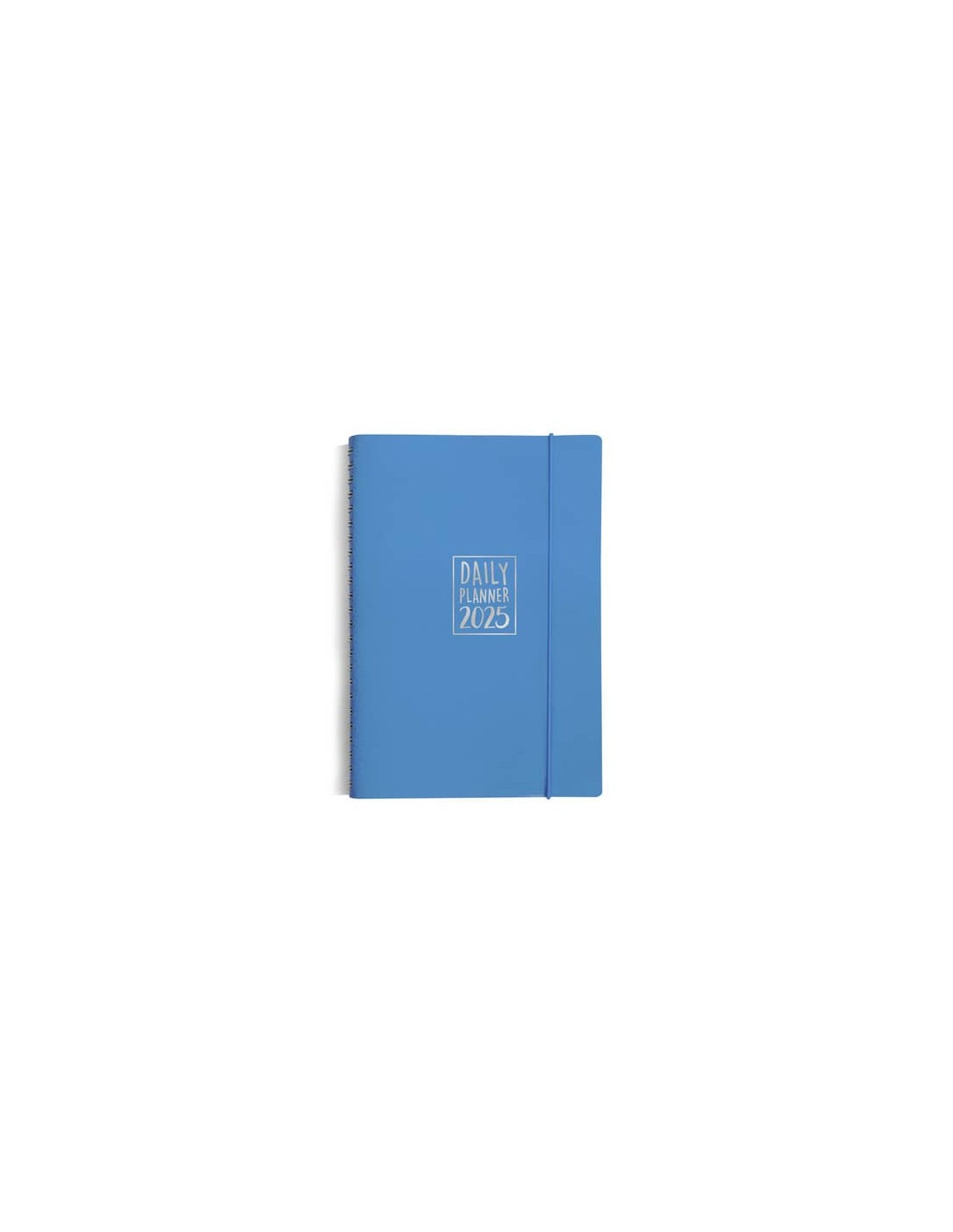 Agenda giornaliera spiralata Biembi 2025. Con copertina in elegante cuoio rigenerato con stampa argento. Elastico verticale rotondo, tono su tono. Interno personalizzato con citazioni e aforismi “Un giorno tira l’altro” per ogni mese. Cellofanata singolarmente e dotata di foglietto esplicativo del contenuto e barcode sul retro. Dimensioni 15x21 cm. Colore azzurro.
