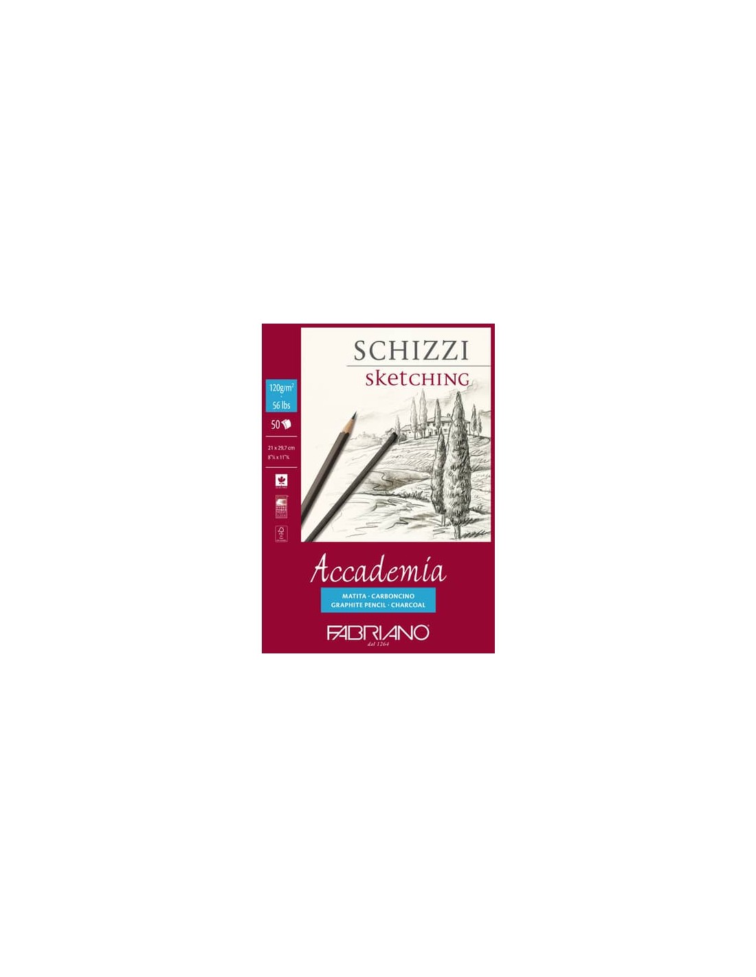 Blocco da disegno linea Accademia, collato in testa prodotto con il 100% di cellulosa ECF, certificata FSC secondo rigorosi standard ambientali, sociali ed economici. Idoneo per carboncino, matita, pastello, sanguigna. Formato A4, blocco da 50 fogli.