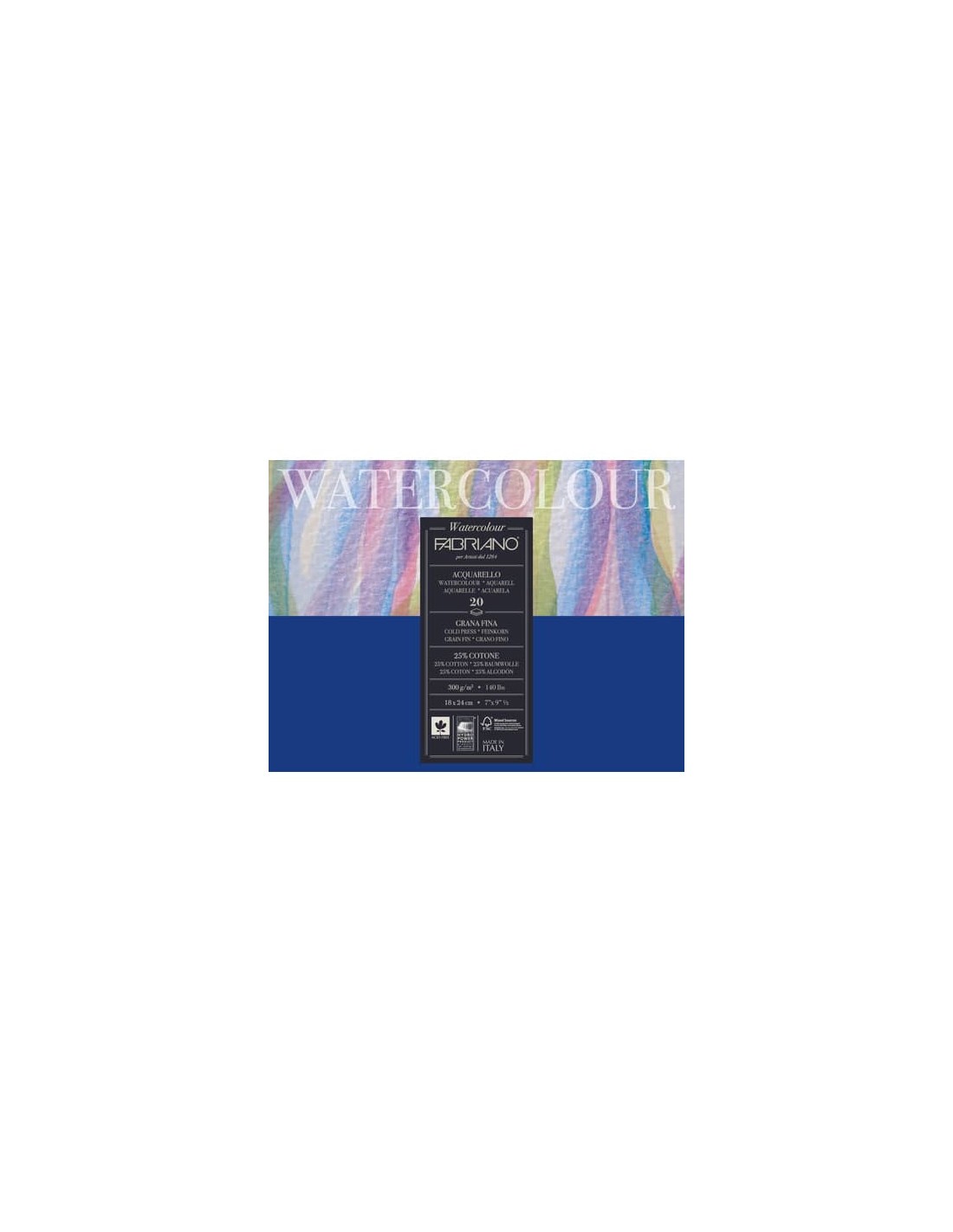Blocco acquerello WaterColour, collato su 4 lati in grana fine. La carta per acquerello Fabriano Watercolour è realizzata con una pregiata miscela di cotone e cellulosa priva di lignina. Prodotta con il 25% di cotone e cellulosa ECF ( Elemental Chlorine Free ), certificata FSC proveniente da foreste gestite da rigorosi standard ambientali, sociali ed economici. L'assenza di acidi garantisce l'inalterabilità nel tempo della carta. Collata in massa e in siperficie assicurando un assorbimento ottimale. Adatta per gli studenti delle scuole di belle arti e per chi si avvicina alle tecniche pittoriche. Ideale per acquerello, tempera, gouache, acrilico, inchiostro e disegno. Formato 18x24 cm, 20 fogli da 300 g.