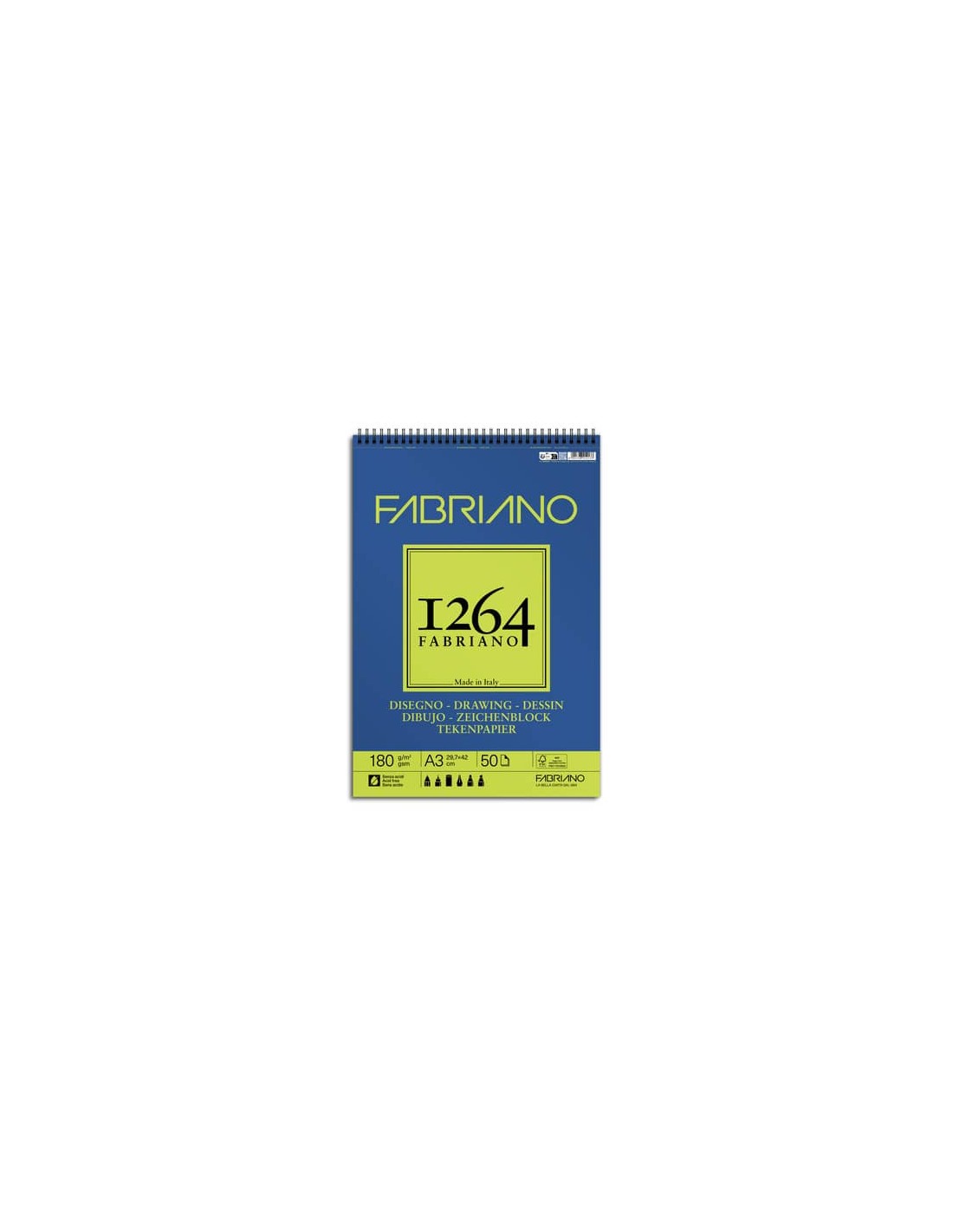 Blocco da disegno spiralato Fabriano 1264, la carta presenta una superficie bianca leggermente ruvida. Vellutata al tatto, consente la realizzazione di disegni accurati fin nei minimi dettagli. I fogli sono microperforati con formato reale dopo lo strappo. Carta certificata FSC, Acid Free e prodotta con energia idroelettrica. Carta da 180 grammi, blocco composto da 50 fogli. Formato A3.