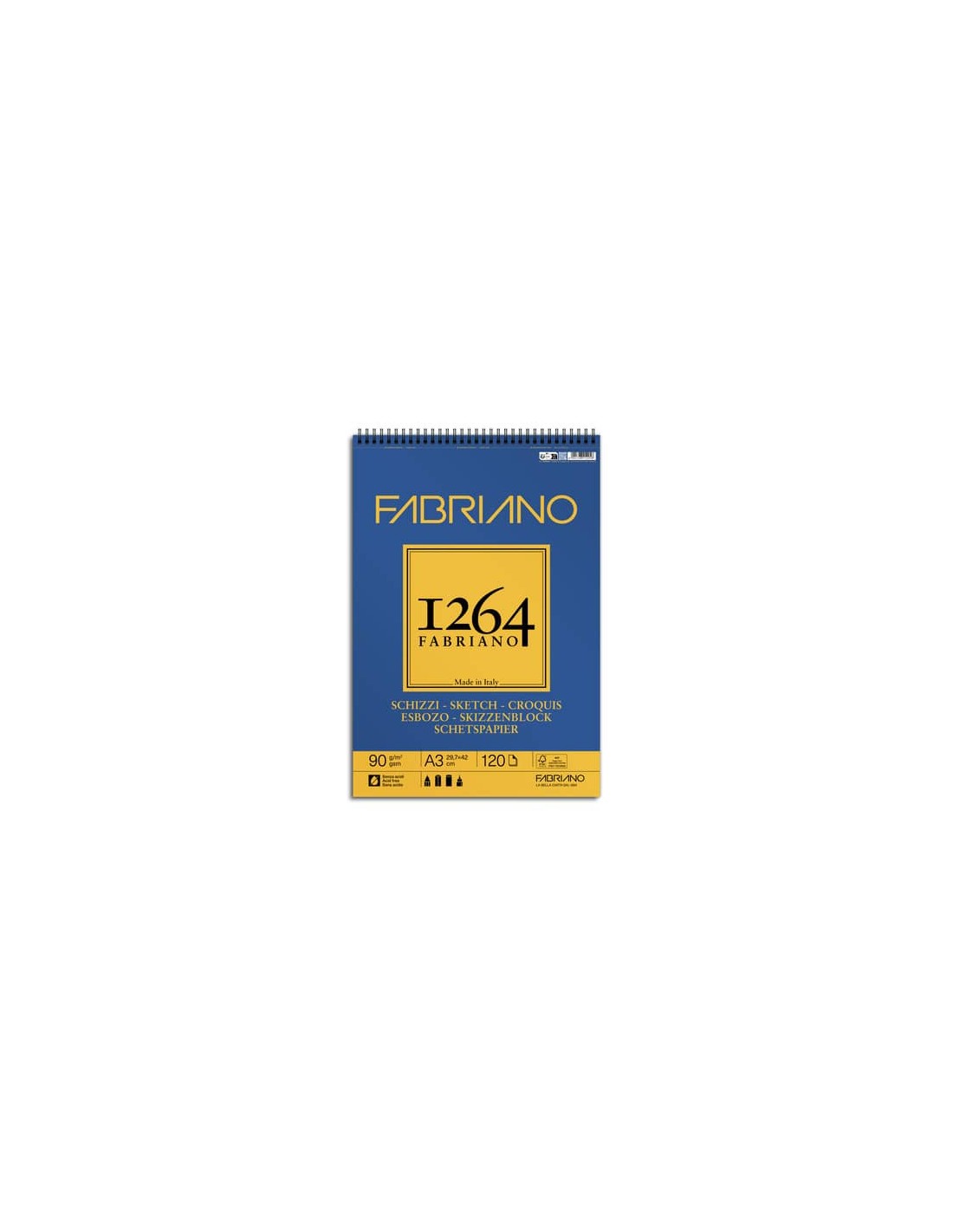 Blocco spiralato 1264 schizzi 90 grammi, la carta presenta una superficie leggermente avoriata con una leggera grana. Permette di realizzare degli schizzi dal vero di una raffinatezza estrema. Fogli microperforati con formato reale dopo lo strappo. Carta certificata FSC, Acid Free e prodotta con energia idroelettrica. Formato A3, 120 fogli.