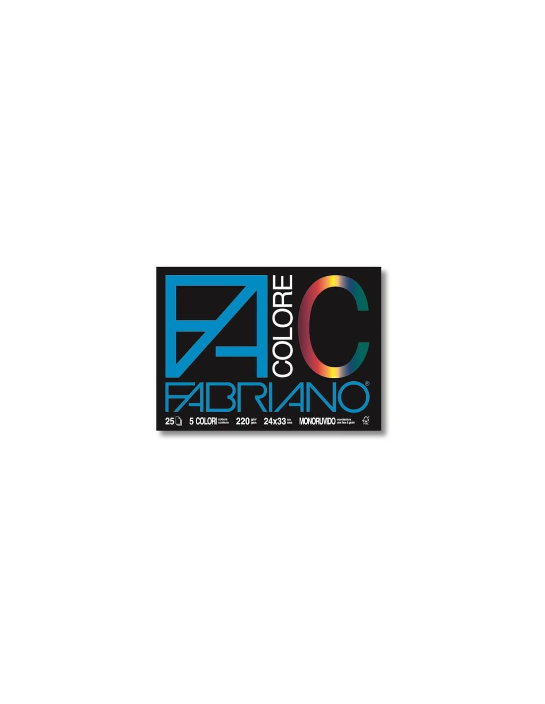 Album Fabriano Colore. Le superfici, liscia da un lato e ruvida dall'altro, rendono questo prodotto particolarmente stimolante per ogni applicazione creativa. La vivacità ed il facile accostamento dei colori fanno di questo prodotto uno splendido veicolo di comunicazione grafica. Colori: giallo, rosso, verde, blu e nero. Formato: 33x48 cm. Grammatura: 220 g/mq. Nr. fogli: 25.