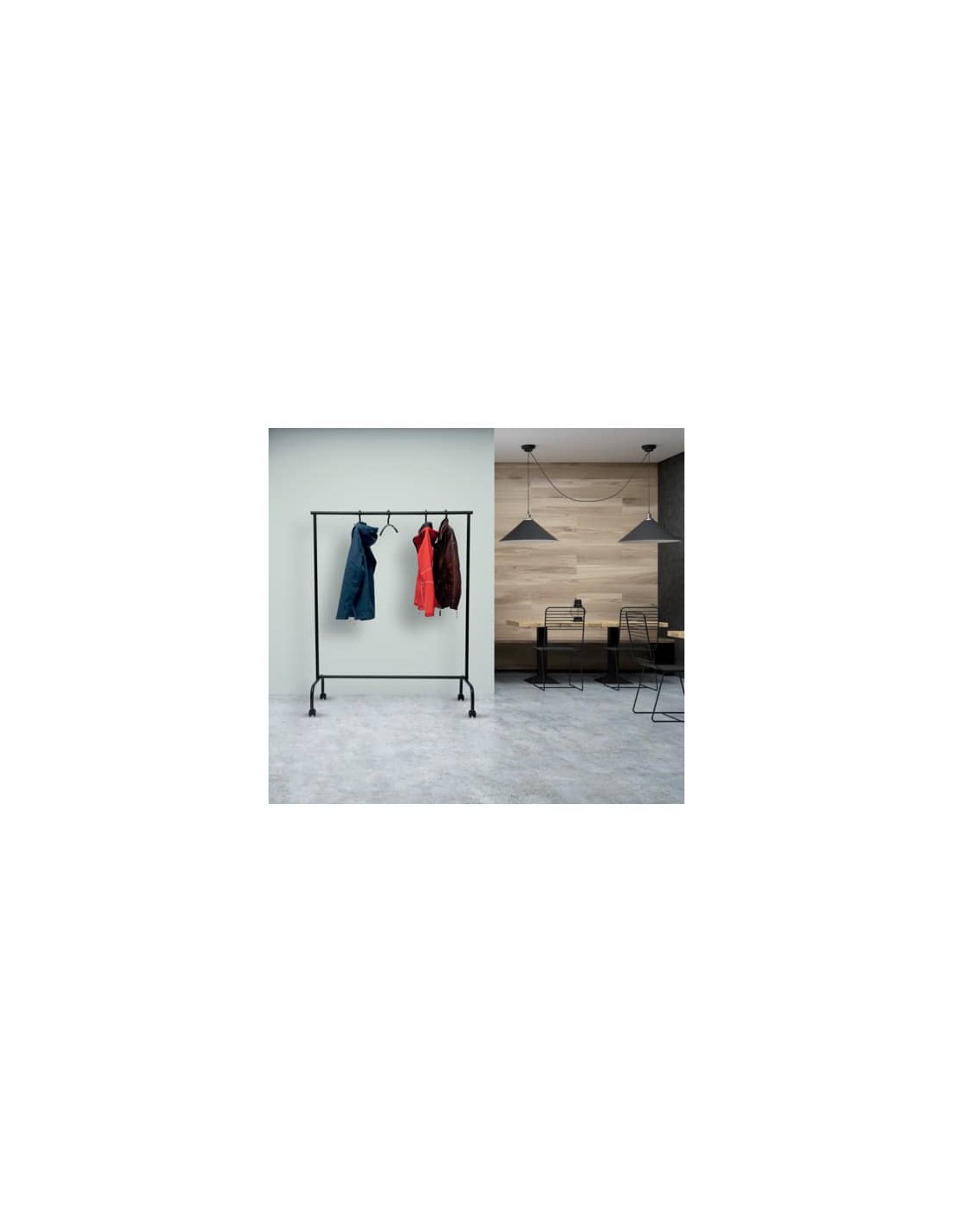 Asta appendiabiti lunghezza 151 cm, Ø 2,5 cm, portata massima 30 kg. Con braccia laterali estraibili estensibili fino a 220 cm. Incluse 4 rotelle doppie Ø 5 cm, di cui 2 bloccabili. Colore nero RAL 9004. Montaggio semplice e veloce.