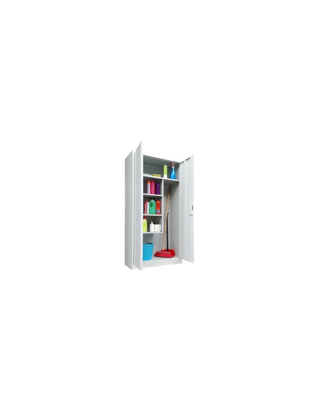 Armadio porta scope a due ante con porte battenti KUBO. Struttura portante realizzata in lamiera d’acciaio di prima scelta presso piegata di spessore 6/10. Serratura/maniglia a “timone” con chiusura a 3 vie e doppia chiave in dotazione. Ante battenti con apertura di 120°. Verniciatura con polveri epossidiche. Colore: grigio (RAL 7035). Nr. ripiani: 4. Materiale fornito smontato ed imballato in colli di cartone.