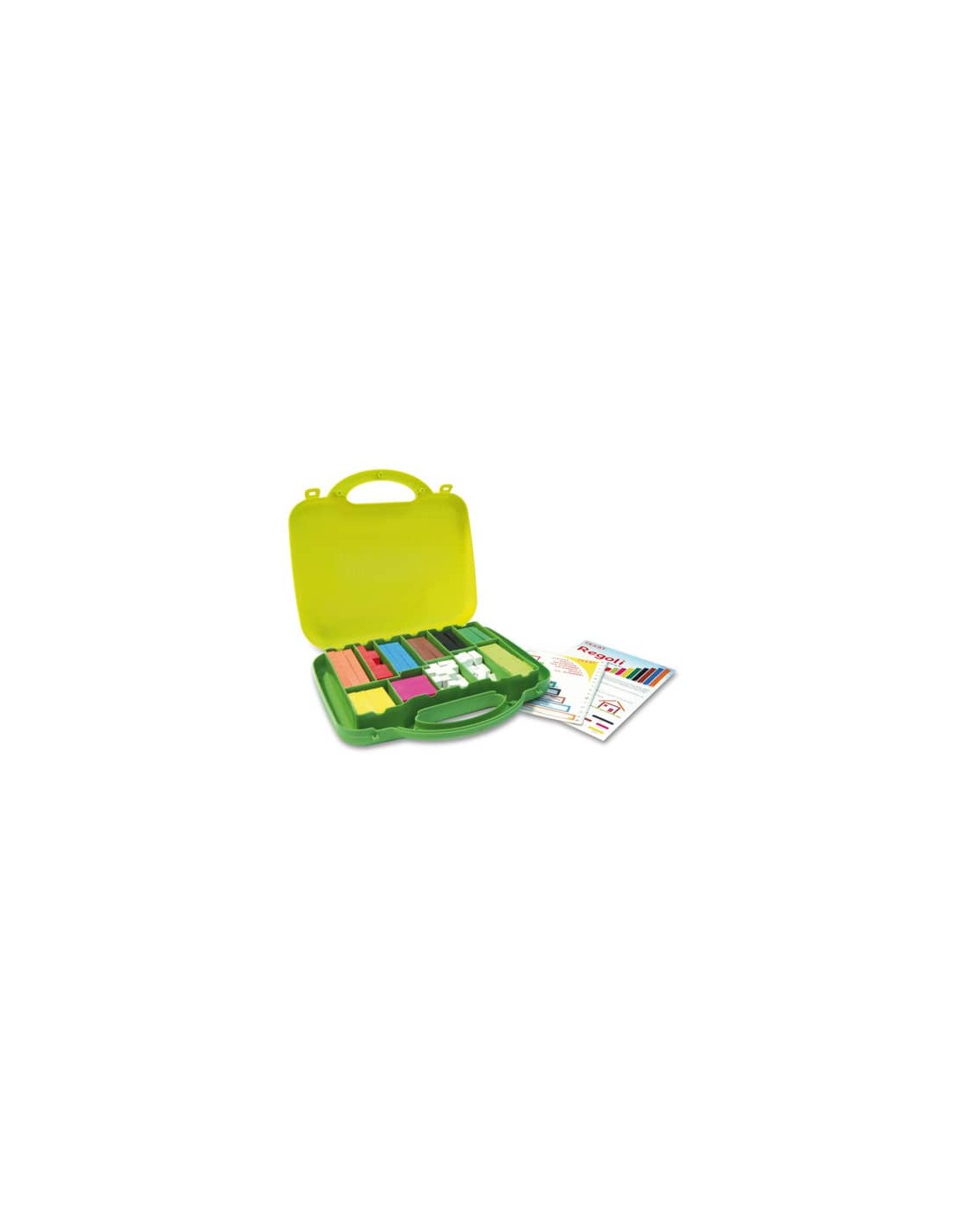 Valigetta da 200 pz colorati: 10 misure/10 colori. Testati con CE. Per l'apprendimento dei colori, la composizione e scomposizione dei numeri e il calcolo matematico. Contiene libretto con esercizi e mascherina per disegnare i regoli sul quaderno.