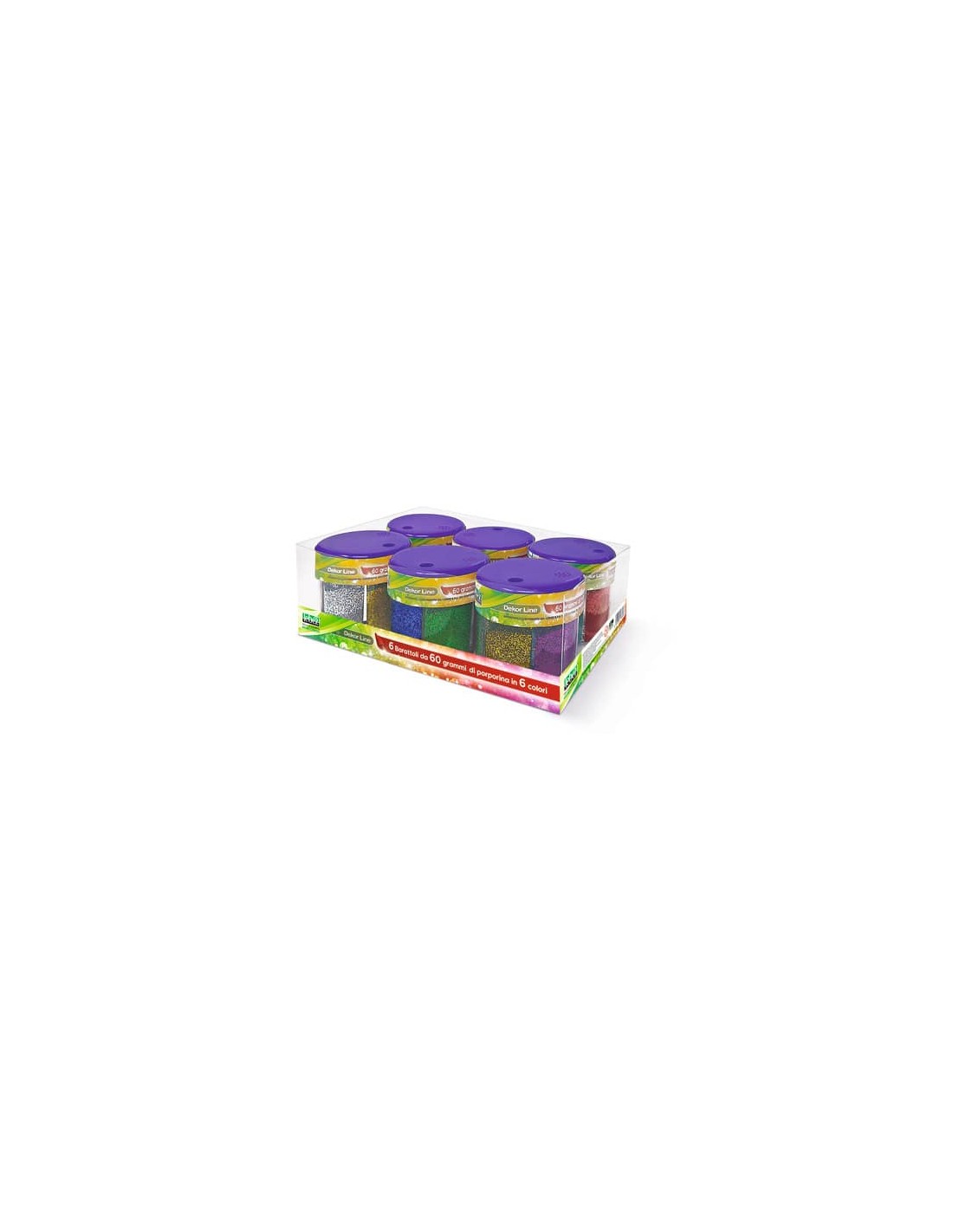 Confezione composta da 6 dispenser da 60 gr cadauno di porporina in 6 colori assortiti (oro, argento, rosso, blu, verde e viola).