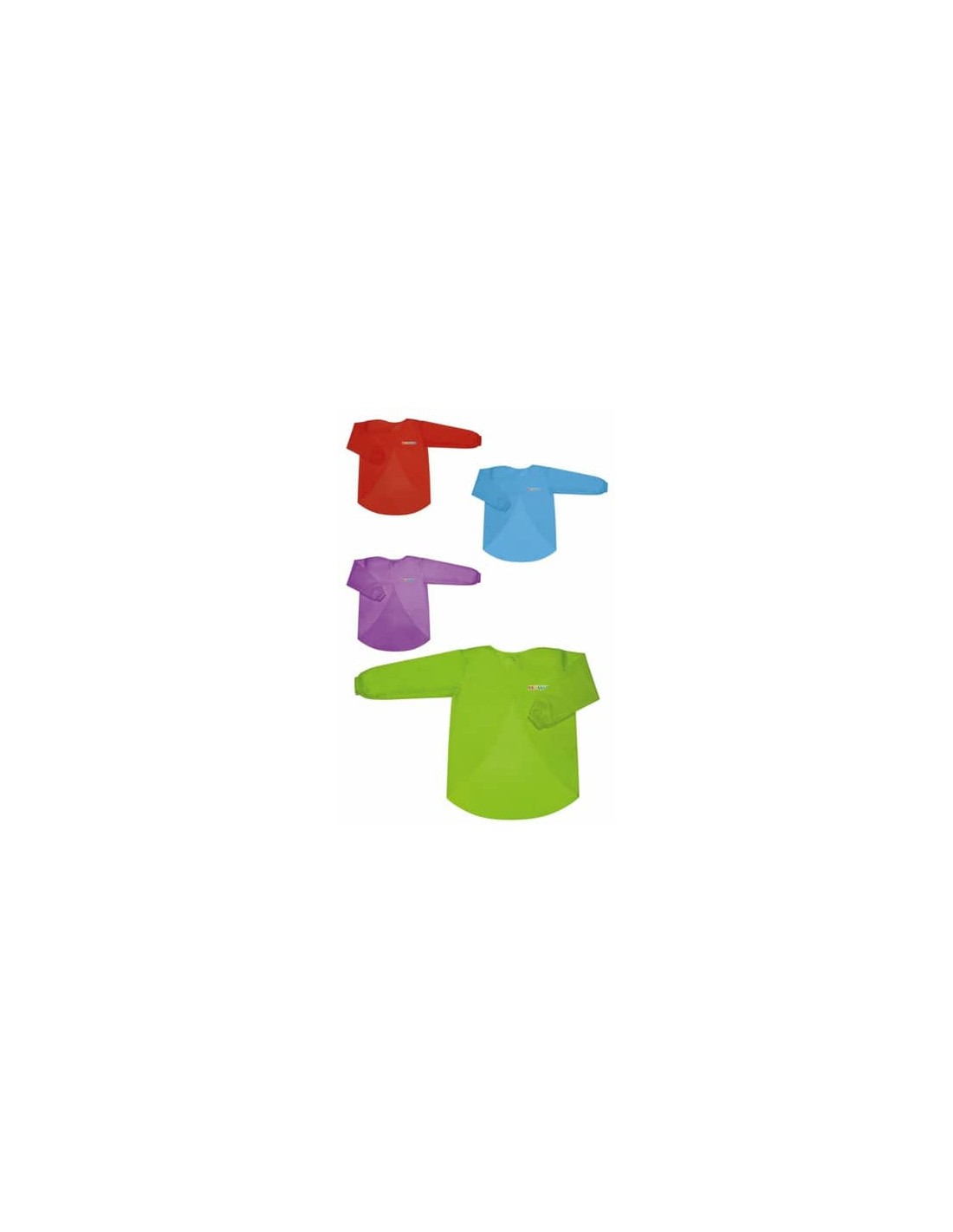 Grembiule in nylon a manica lunga, lavabile e personalizzabile, per colorare in libertà. Taglia unica in formato 45x60 cm. Busta appendibile da 1 pezzo. Colori assortiti: Azzurro - verde - rosso.