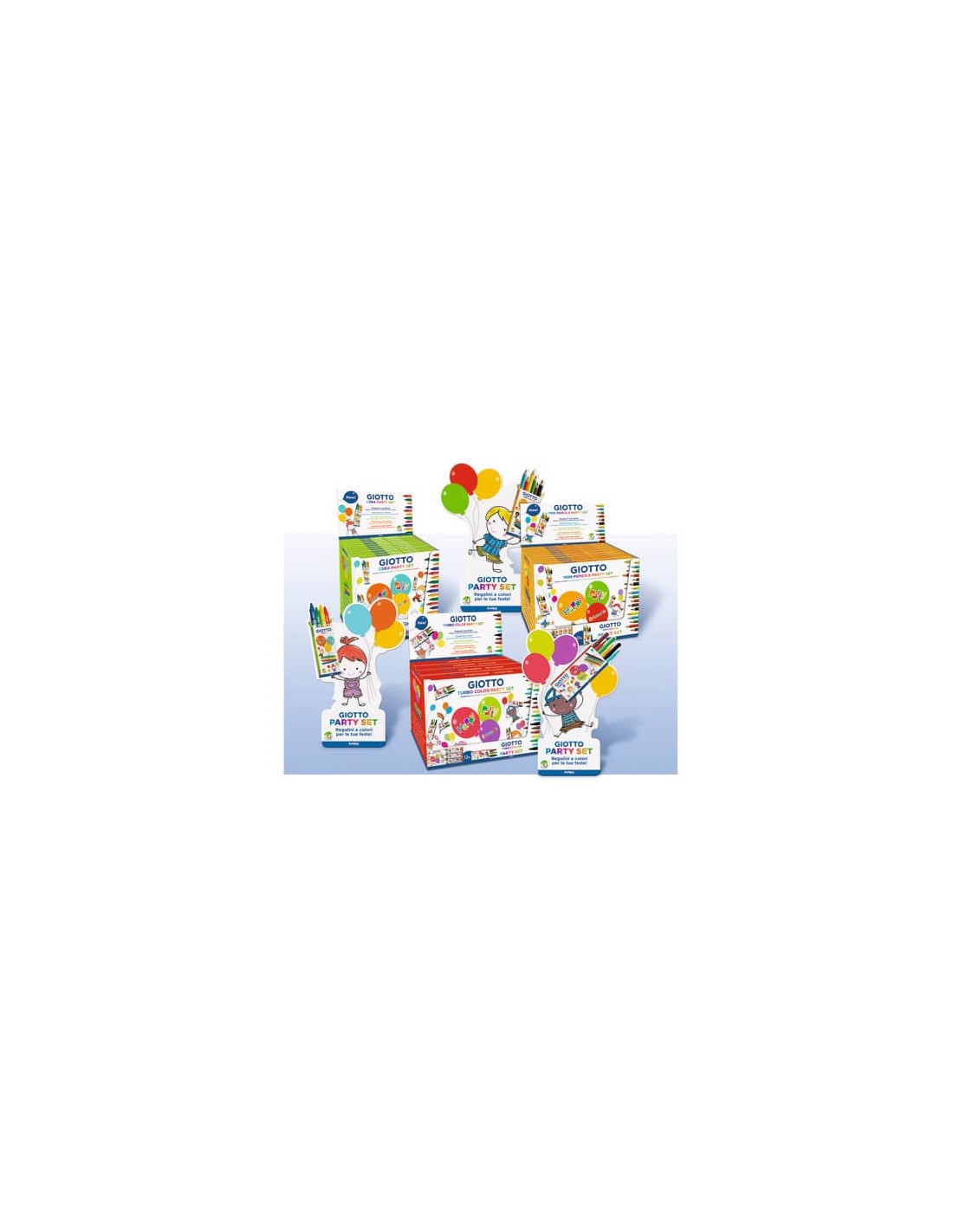Espositore Giotto Party Set Kit con 3 display. Ogni Display contiene vari set. Giotto Cera Party Set - ogni Display contiene 10 Set. Giotto TurboColor Party Set - ogni Display contiene 4 Set. Giotto Pencils Party Set - ogni Display contiene 10 Set + materiale POP per vestire a festa il negozio o la vetrina: 1 roter da appendere al soffitto e 3 sagomati da abbinare a ciascun prodotto.