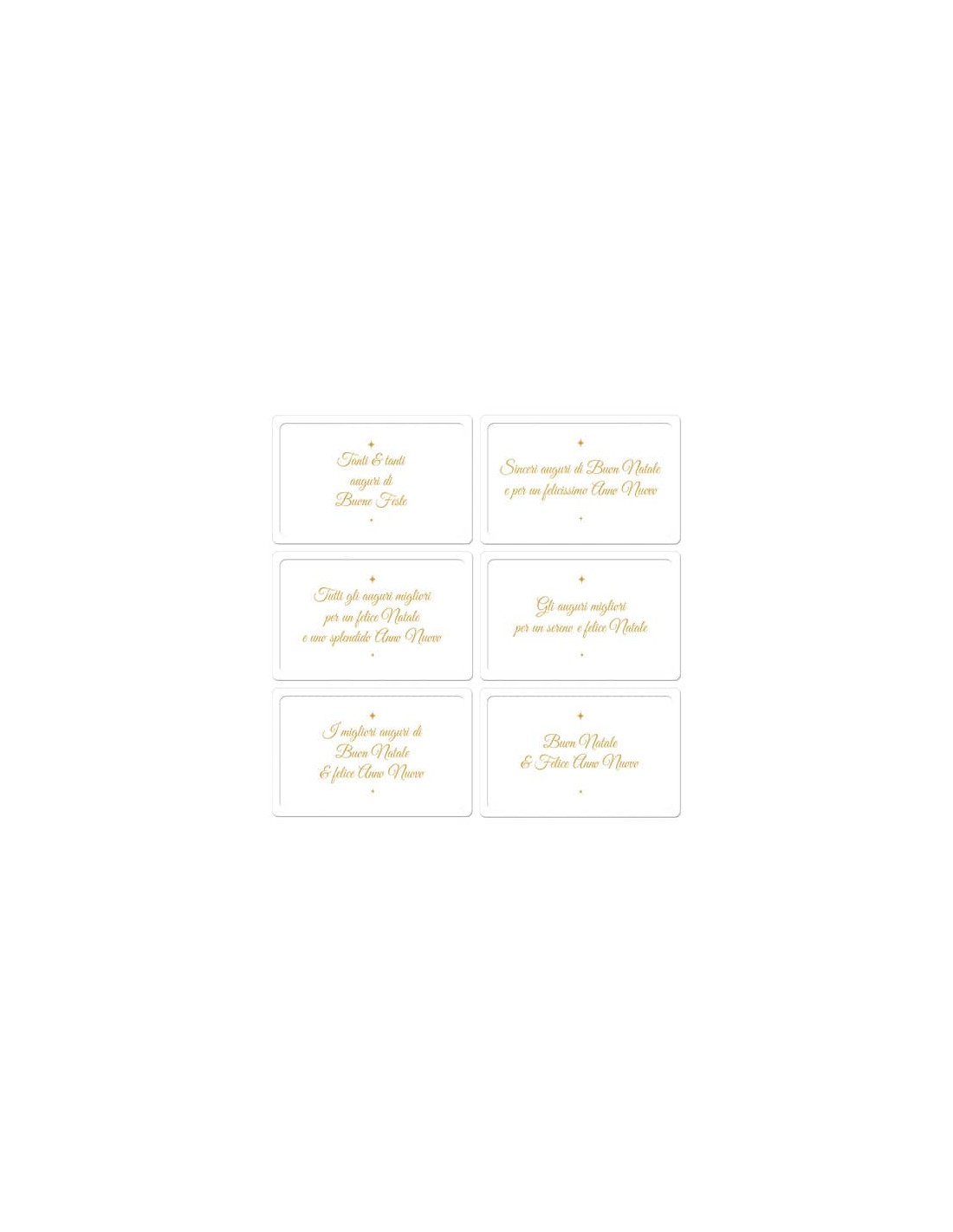 Biglietti Natalizi in vassoio, in cartoncino bianco con busta e scritta oro. Formato 9x14 cm, confezione da 6 pezzi.