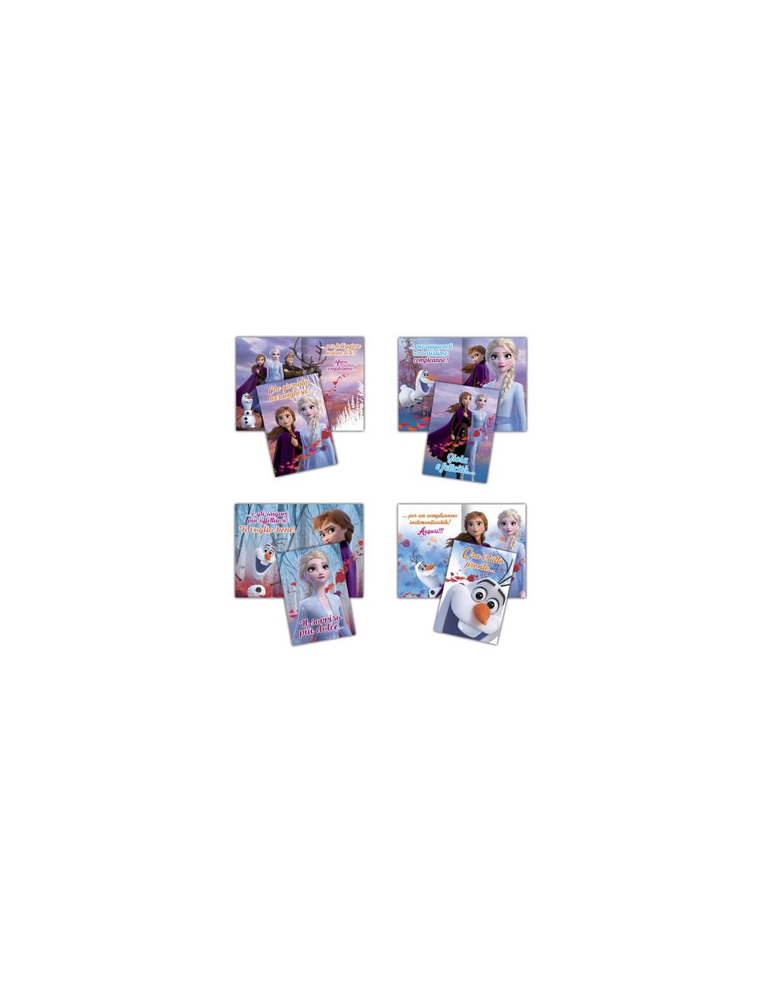 Biglietti auguri Frozen 2 glitter. Assortito fantasia. Dimensioni: 11,5x16,8 cm. Grammatura: carta patinata 300 gr/mq. Stampa a 4 colori. Scatola trasparente da 12 pz con busta colorata.