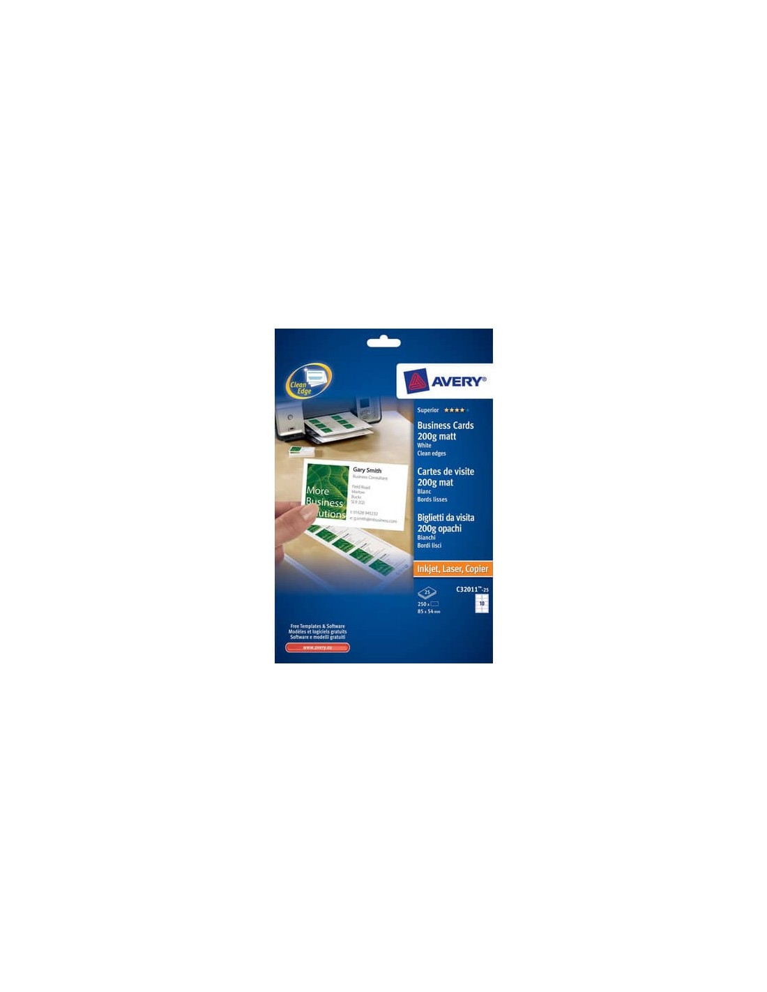 Biglietti da visita in carta bianca opaca con tecnologia Quick&Clean™, adatti a stampanti Laser, stampabili fronte/retro. Biglietti da visita fai da te, personalizzabili online con il software Avery Crea e Stampa. Puoi stampare da solo i tuoi biglietti da visita con la tua stampante laser, direttamente da casa o dall'ufficio, senza rivolgerti a un fornitore esterno. In questo modo risparmierai denaro ed avrai biglietti da visita sempre aggiornati e dall'aspetto professionale. Possono essere anche utilizzati per inviti e lettere o biglietti di ringraziamento. Realizzati con tecnologia Avery Quick&Clean™™ che permette di ottenere biglietti da visita con bordi perfettamente lisci e di separare i cartoncini con la semplice piegatura del foglio. Carta Certificata FSC®.