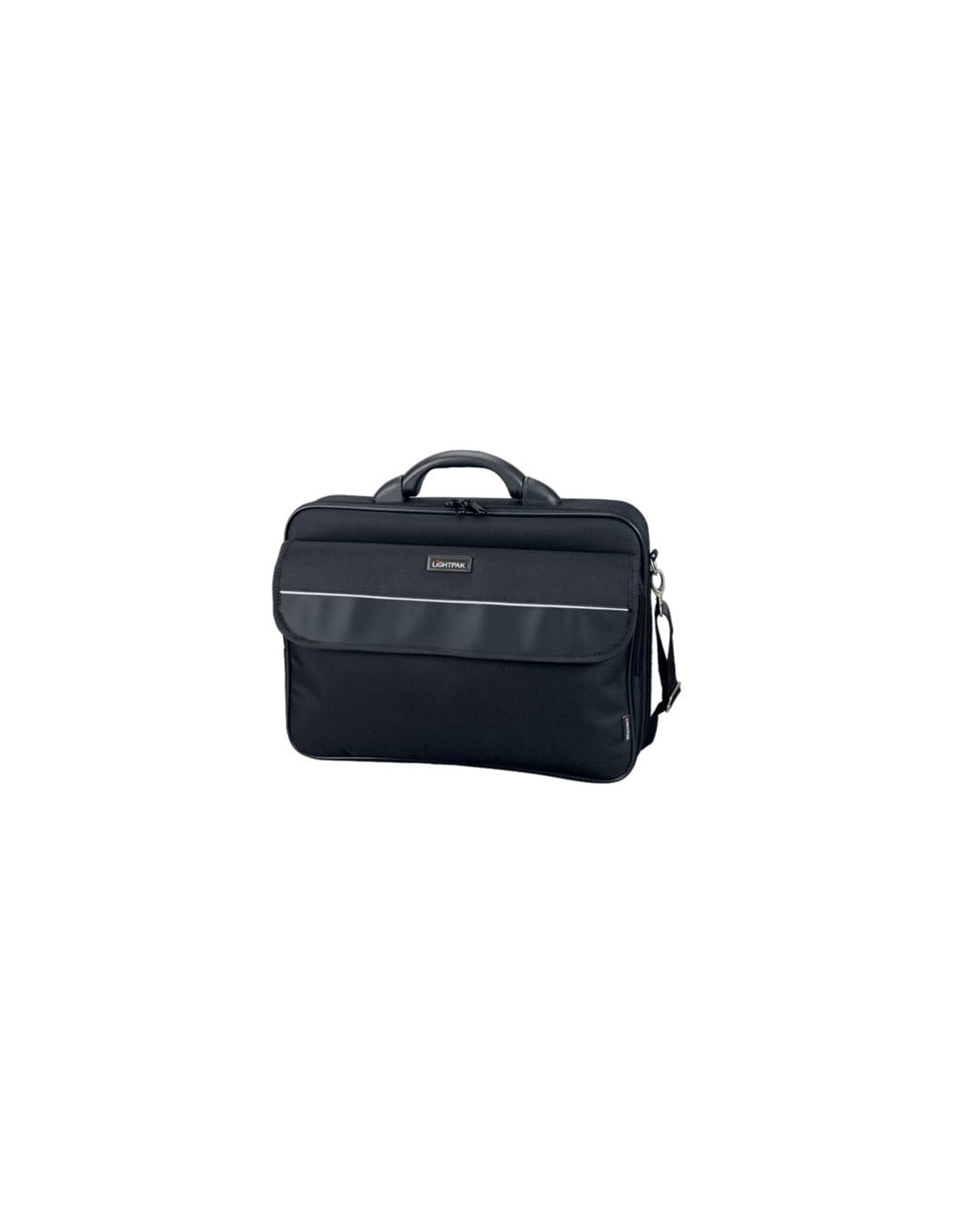 Borsa porta PC con manici in plastica, tracolla rimovibile, cintura per trolley, scomparto a cerniera con sezione organizer davanti. Scomparto imbottito per PC, scomparto formato A4, porta CD, tre passanti portapenne, porta cellulare. Colore: nero.