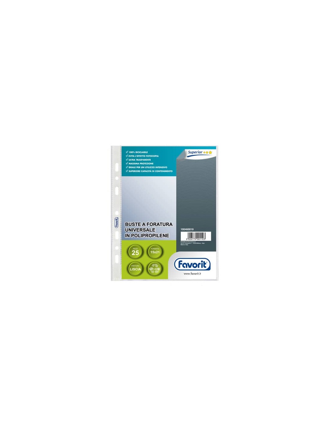 Buste Favorit confezione da 25 pezzi a foratura universale in polipropilene, formato interno 15x21, finitura liscia.