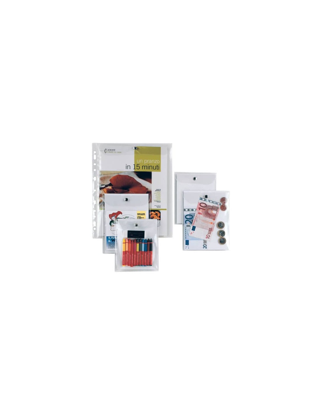 Buste in PVC trasparente, alto spessore, con patella e bottone di chiusura in metallo. Ideali per istruzioni, documenti, campioni, certificati di garanzia, monete, disegni, agende.
