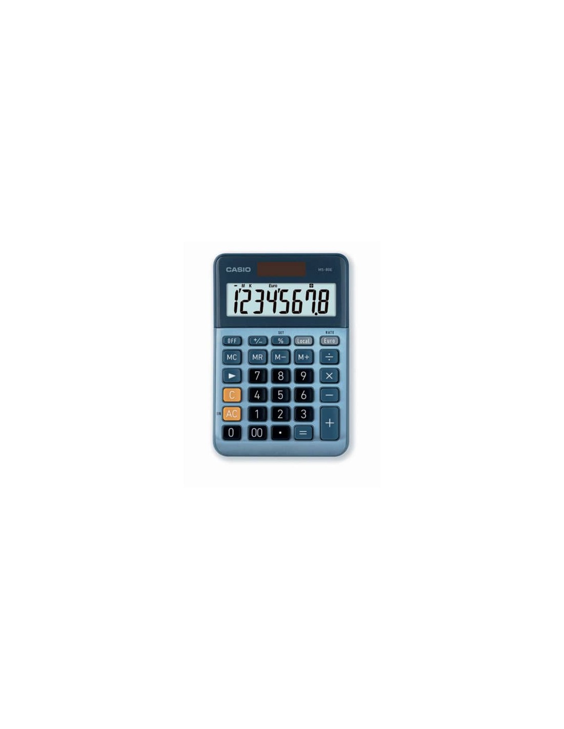 Calcolatrice da tavolo con display LC EXTRA BIG a 8 cifre, doppia alimentazione solare e batteria. Piedini in gomma e tasti in plastica, struttura in metallo di colore blu. Funzioni: conversione Euro, calcolo percentuale con margine di profitto, separatore di migliaia, indicatore comando funzione. Tasto simbolo più/meno, 4 tasti memoria, tasto backspace e doppio zero. Dimensioni LxHxP: 10,1x2,9x14,9 cm. Peso circa 115 g, batteria 1 x LR1130.