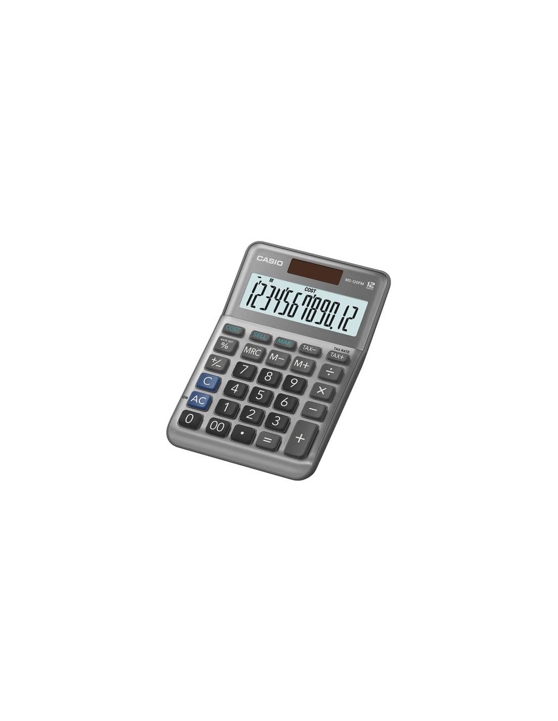 Calcolatrice da tavolo CASIO con nuovo design, scocca in metallo e ampio display a 12 cifre. Dotata delle seguenti funzioni: calcolo delle imposte, calcolo del profitto (costo, vendita, margine), tasto doppio zero, separatore di migliaia, 3 tasti memoria e tasto per cancellare l' ultima cifra. Alimentazione combinata: solare e batteria. Utilizza pile LR54. Dimensioni: 2,8x10,1x14,9 cm. Peso 120 gr.