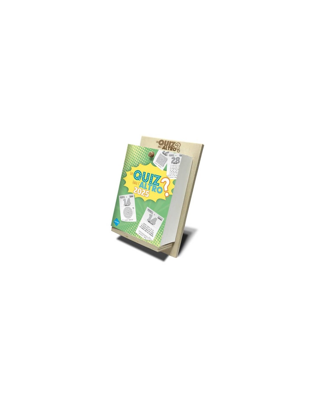 Calendario giornaliero, arricchito con 365 giochi ed indovinelli. Calendario da tavolo. Design semplice e funzionale. Supporto inclinato in legno di betulla. Confezionato in scatola personalizzata. Dimensioni blocco: 10 x 14 x 4 cm (A6). Dimensioni supporto: 12 x 19 cm.