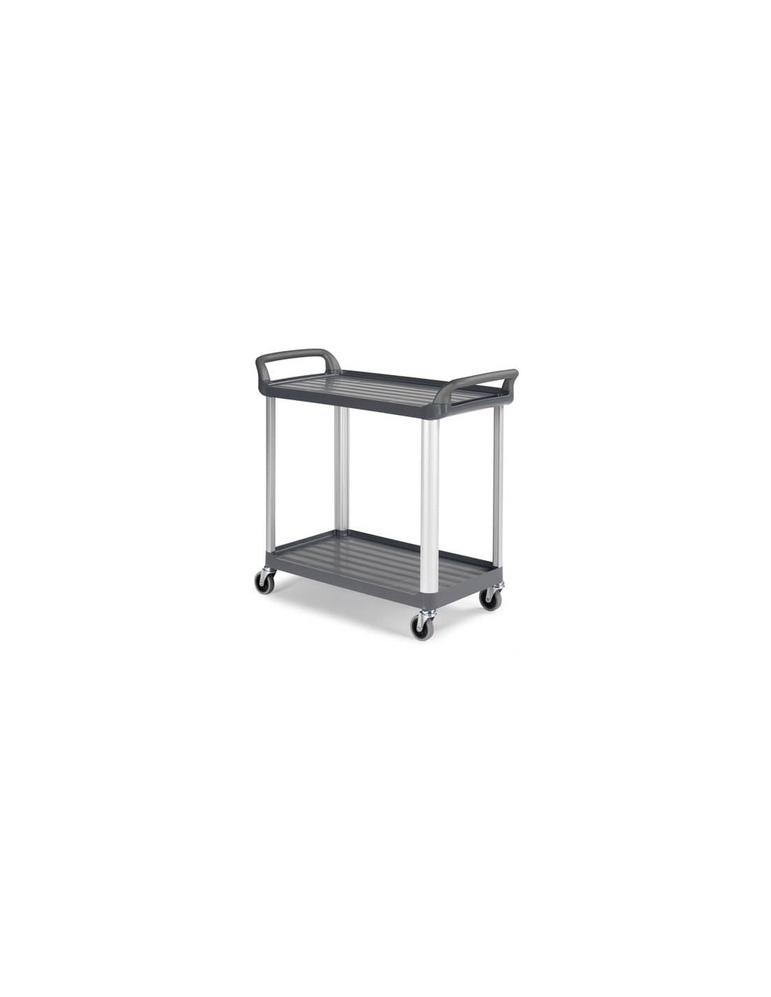 Carrello a 2 ripiani Shelf 3730 TTS in polipropilene con montanti in alluminio. Colore grigio. Ideale per il trasporto o stoccaggio di attrezzatura e per servizio in mense. La portata massima di ogni ripiano è di 50 Kg. Diametro delle ruote 125 mm. Dimensioni 111 x 50 x 105 cm.