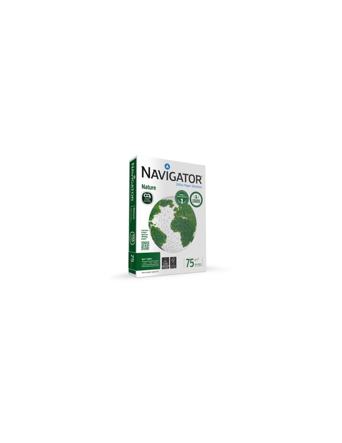 Carta per fotocopie Navigator Nature. Formato: A3. Grammatura: 75 g/m². Punto di bianco 169 CIE. Ideale per stampanti laser e a getto d'inchiostro, nonché per fotocopiatrici. Prodotto certificato FSC ed Ecolabel. Disponibile in risma da 500 fogli.