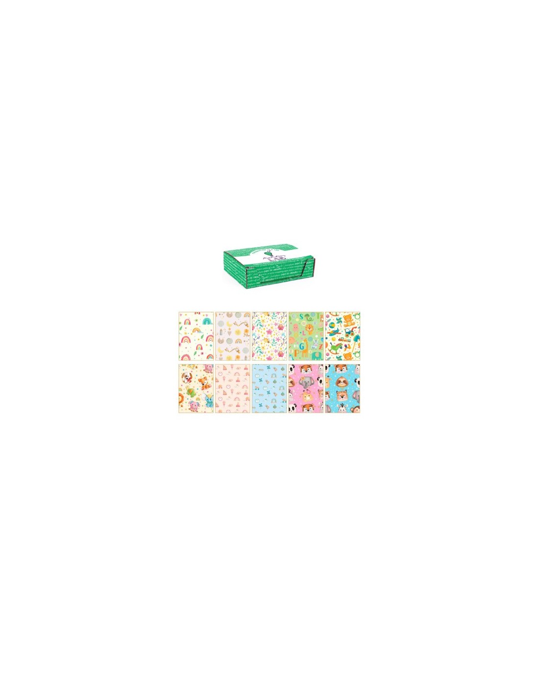 Carta regalo Kartos assortimento Baby. Formato 70 x 100 cm in confezione da 100 fogli piegati in sedicesimi. Formato chiuso 34 x 25 cm. Stampa offset su carta patinata da 80 g/m². Disponibile in 10 soggetti assortiti.
