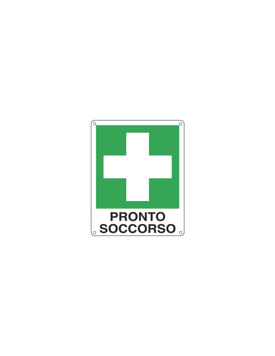 Cartello d'emergenza "Pronto soccorso". Sfondo bianco con immagini verdi. UNI ISO 7010. Alluminio piano spessore 5/10. Dimensioni: 12x14,5 cm
