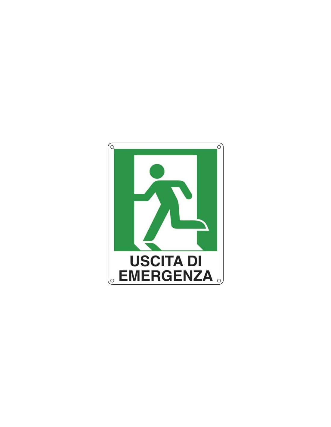 Cartello sicurezza "Uscita di emergenza sinistra". Sfondo bianco con immagini verdi. Simbolo + testo. EN ISO 7010. Alluminio piano spessore 5/10. Dimensioni: 25x31 cm