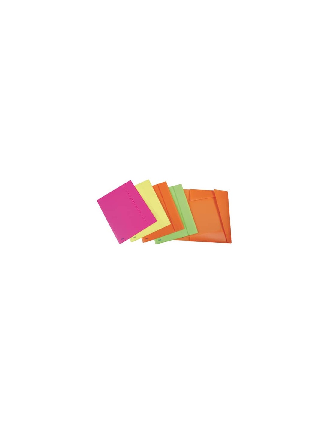 Cartelle 3 lembi con elastico Neon realizzate in polipropilene opaco dai colori fluo. Chiusura con elastico tondo in tinta. Formato esterno 33,5x44 cm. Formato interno 32x42 cm. Dorso 0-2 cm. Colori assortiti: fucsia, giallo, arancio e verde.