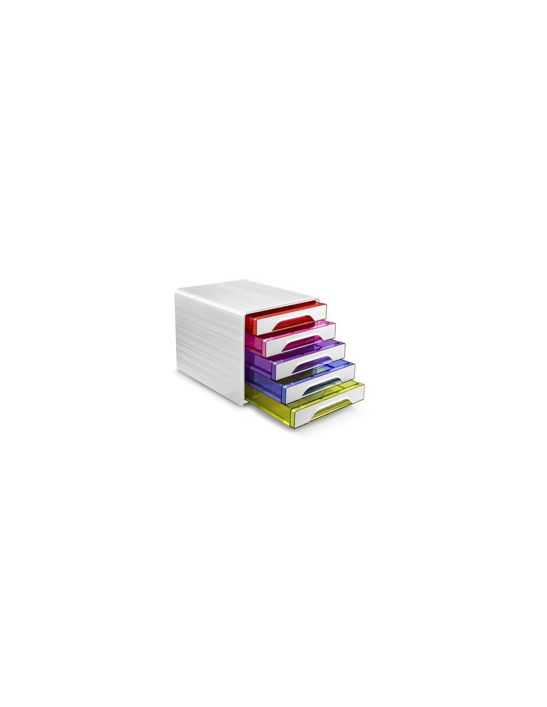 Cassettiere 5 cassetti impreziosite a decori in rilievo per una finitura contemporanea e raffinata. Custodia monoblocco molto robusta. Sovrapposizione superbamente stabile su più livelli. I cassetti sono dotati di maniglie ergonomiche, un foro di presa per facilitare la presa dei documenti contenuti e di blocco per evitare la fuoriuscita accidentale dalla cassettiera. Possono contenere documenti fino al formato 24x32 cm. Intercambiabili consentono una disposizione personalizzabile. Capacità utile di un cassetto: 322 x 244 H 40 mm. Piedini antiscivolo ed etichette di indentificazione del contenuto fornite. Realizzate in polistirene antiurto, riciclabile al 100%. Dimensione totale 360 x 288 H 271 mm.
