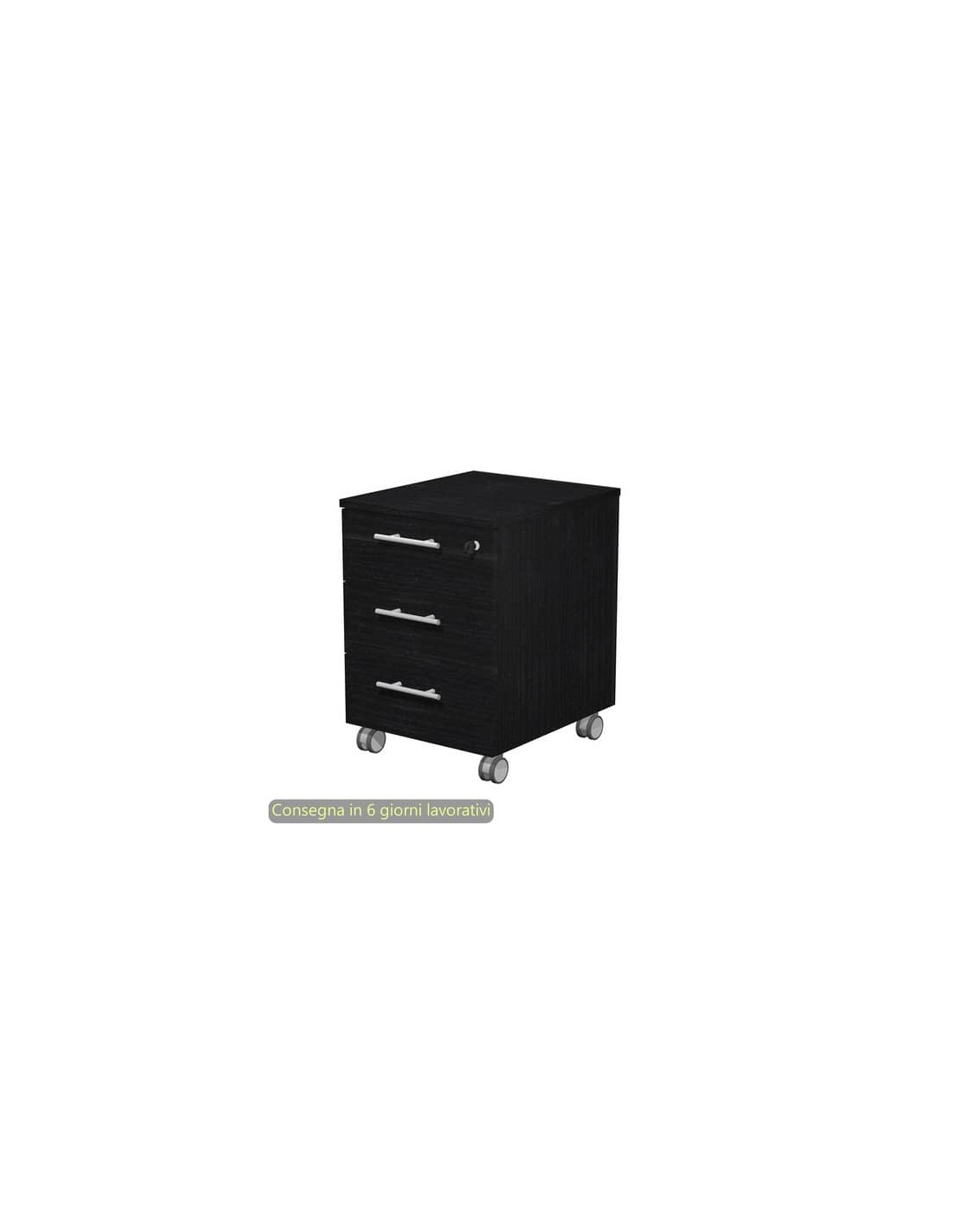 Top, base, fianchi e frontalini di spessore 18 mm. Dietro di spessore 10 mm. Cassetti con maniglie in metallo e guide metalliche con fermo a fine corsa. Completa di serratura sul primo cassetto e ruote pivotanti.