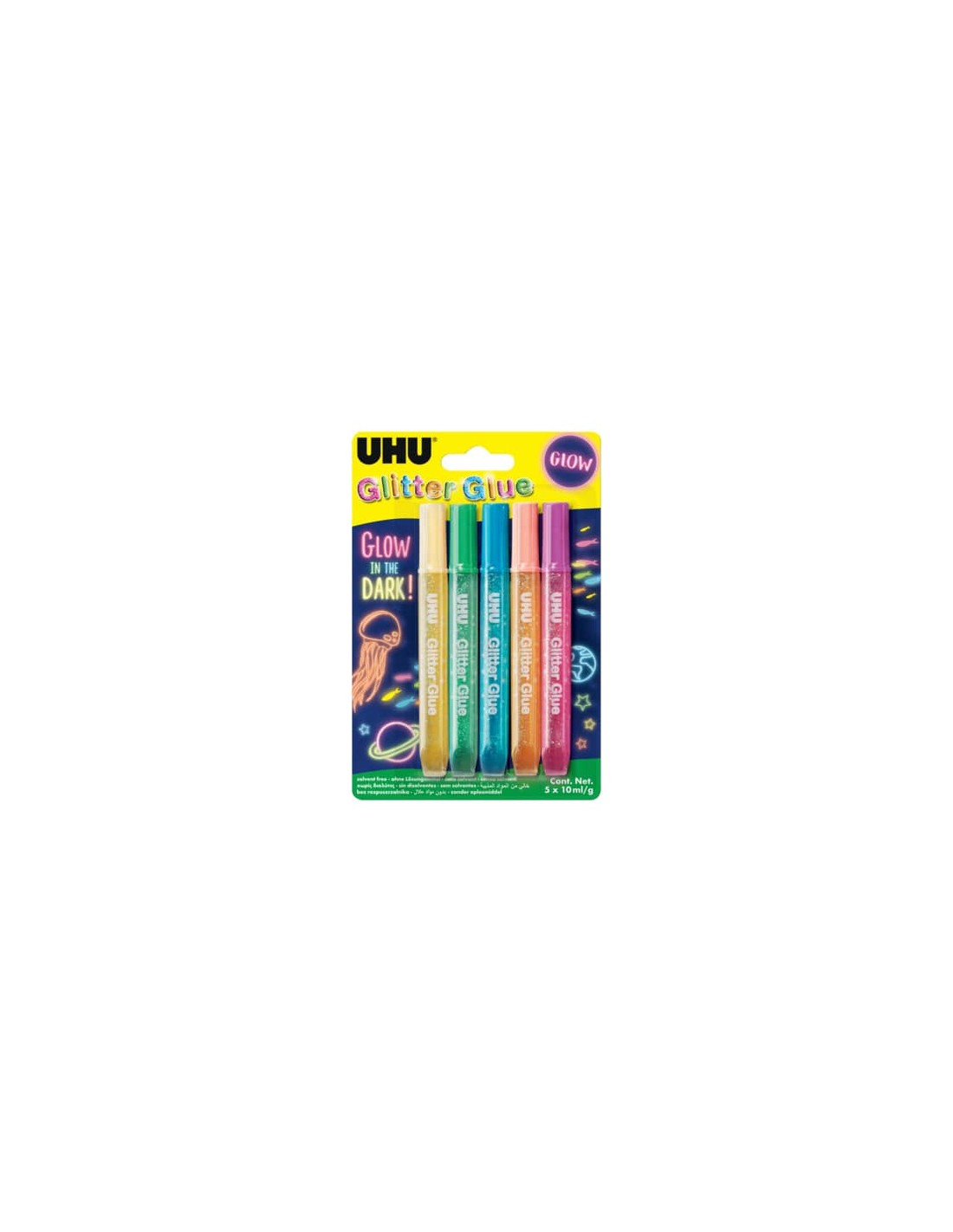 La colla glitterata colorata che si illumina al buio. Dermatologicamente testata e priva di solventi, è perfetta per essere utilizzata in autonomia anche dai bambini. UHU Glitter Glue Glow in the Dark è perfetta per dare un tocco vivace ad ogni tipo di lavoretto e decorazione lasciando senza parole tutti grazie all’effetto fosforescente. Il pratico formato in penna con beccuccio di precisione permette di effettuare anche le decorazioni più minuziose. Tubetto extra morbido. Con erogatore di precisione. In 5 diverse colorazioni: giallo, verde, azzurro, arancione e rosa.