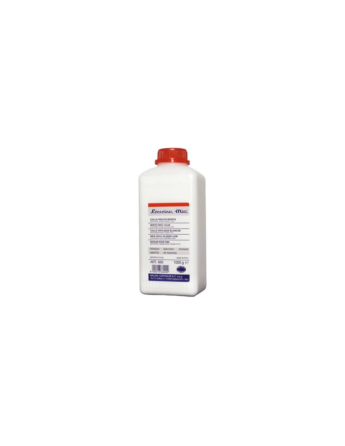 Colla vinilica in flacone da 1000 grammi. Mantiene il tradizionale profumo di mandorla ed è ideale per carta, cartoni, etichette, tessuti e anche legno.