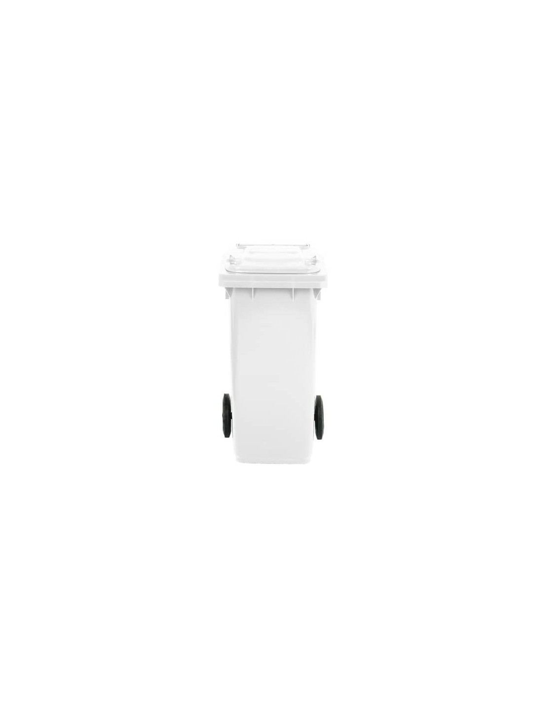 Bidone carrellato a due ruote per raccolta differenziata capacità 120 litri completo di coperchio. In PEHD(polietilene alta densità). Prodotto certificato TÜV in accordo alla norma EN840. Tipologia bidone: classe I B e presa frontale tipo A. Assale in acciaio zincato 40 micron. Ruote in gomma diametro 200mm. Forza di trazionamento < 60 N. In accordo alla Direttiva 2000/14/CE (emissioni acustiche < 97dB). Altezza: 930 mm. Coperchio: 480 mm. Peso: 9 Kg. Colore: bianco.