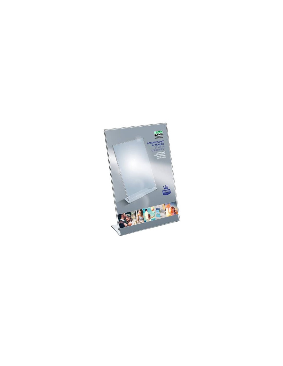 Portadepliant verticale in acrilico trasparente con base a ''L''. Formato 20x30 cm. Colore trasparente.
