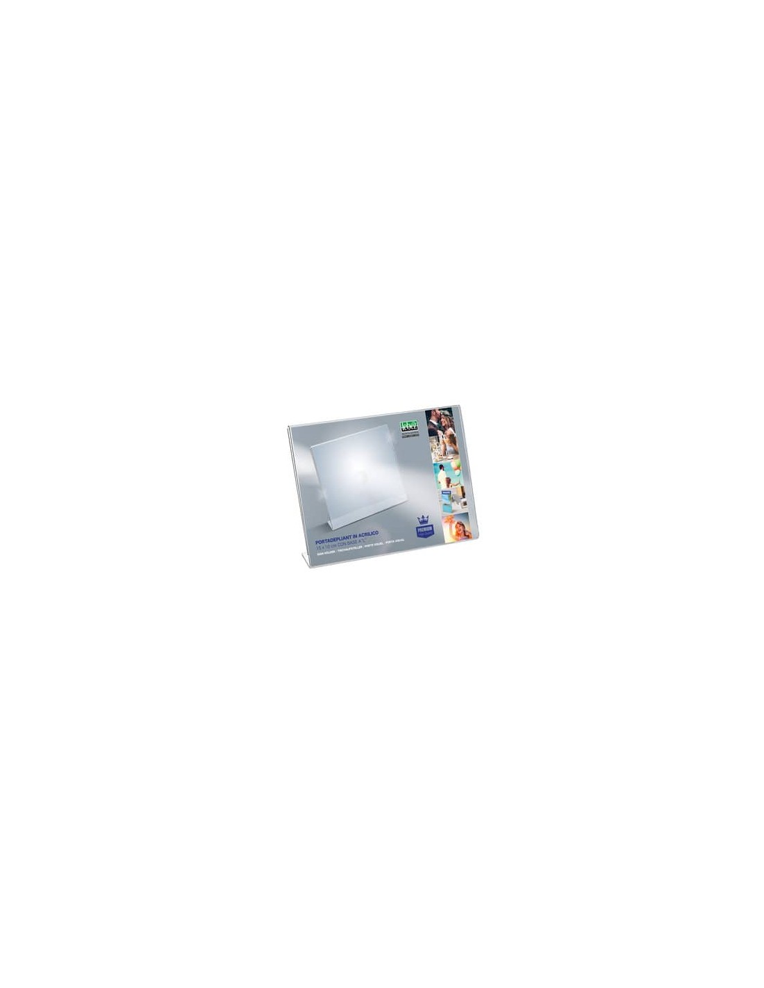 Portadepliant orizzntale in acrilico trasparente con base a ''L''. Formato 15x10 cm. Colore trasparente.