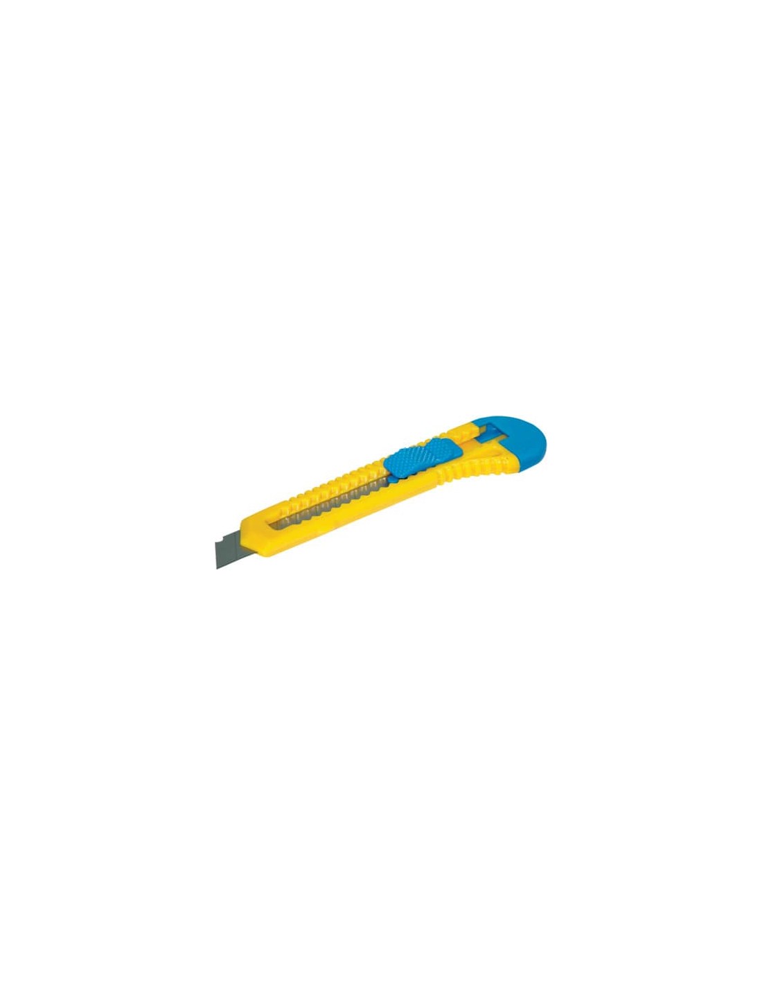Cutter a lama trapezioidale. Lama a scatto. Blocco per lama. Involucro in plastica. Larghezza lama 18 mm. Lunghezza lama 100 mm. Colore blu e giallo.