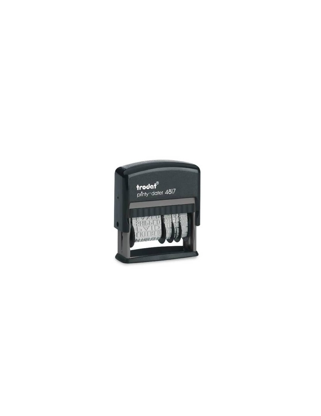 Timbro Polinome Datario autoinchiostrante. Altezza caratteri 3,8 mm. Leggero e compatto. Validità datario 12 anni. Testi: FATTURATO; MAILED; VERIFICATO; REGISTRATO; SPEDITO; ORDINATO; SCADENZA; VISTO; FAXATO; PAGATO; RISPOSTO; RICEVUTO. Massima qualità delle impronte. Inchiostro indelebile in conformità alla norma DIN ISO 14145-2. Modello cartuccia di ricambio Trodat 6/4817. Sostituzione della cartuccia semplice e pulita.
