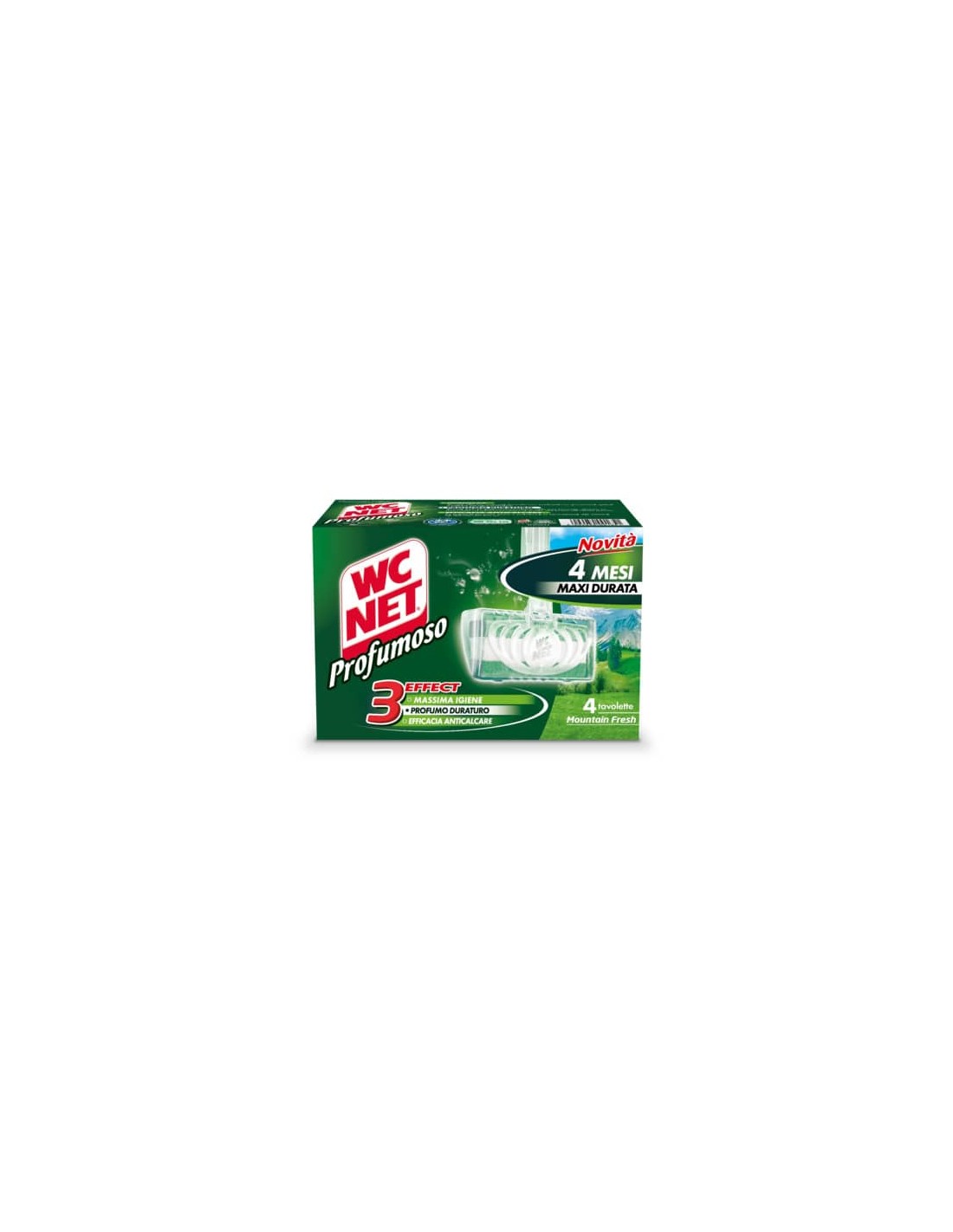 WC NET Profumoso 3 Effect garantisce igiene, profumo ed efficacia dal primo all'ultimo giorno. Igienizza: grazie alla sua speciale formula con ossigeno attivo garantisce igiene e pulizia. Profumo duraturo: grazie agli oli essenziali contenuti nella sua formula, rilascia un piacevole ed intenso profumo di pulito. Efficacia anticalcare: la speciale formula aiuta a prevenire la formazione del calcare nel tuo wc. Modalità d'impiego: svolgere il gancio e agganciare la tavoletta sotto il bordo del WC dove scende più acqua. Profumazione: Mountain Fresh. Contenuto: 4x34 gr.
