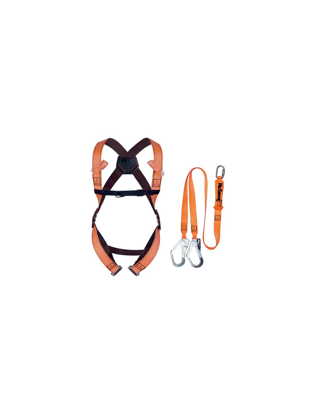Kit anticaduta arancio pronto all'uso: imbracatura 2 punti di ancoraggio anticaduta (dorsale - sternale). 2 fibbie di regolazione. 2 placche laterali di regolazione (Rif. HAR12). Anticaduta ad assorbitore di energia con corda trefolata doppia (Y). 1 moschettone AM018 e 2 connettori AM022 (Rif. AN213200ZDD). Imbracatura anticaduta: Cinghia in poliestere. Corda ad assorbimento di energia: Cinghia in poliestere. Moschettone e gancio: Acciaio.