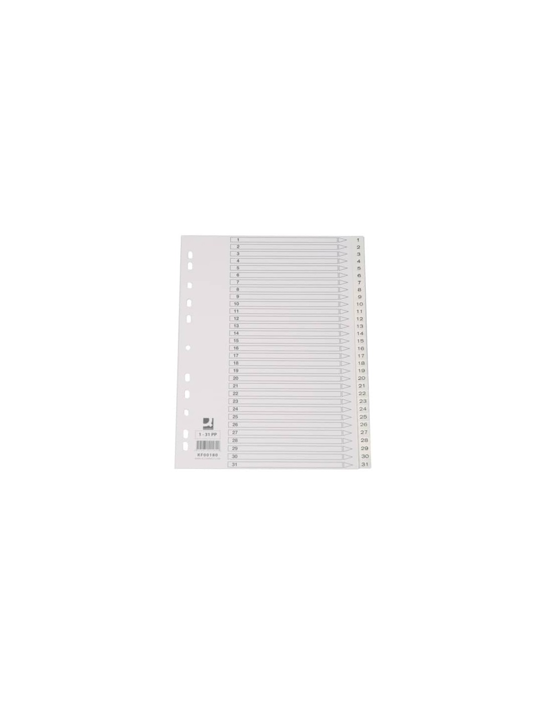 Divisori numerici 1-31 in ppl 120 my con indice scrivibile, tasti stampati, foratura universale. Formato 22,5 x 29,7 cm. Colore bianco.
