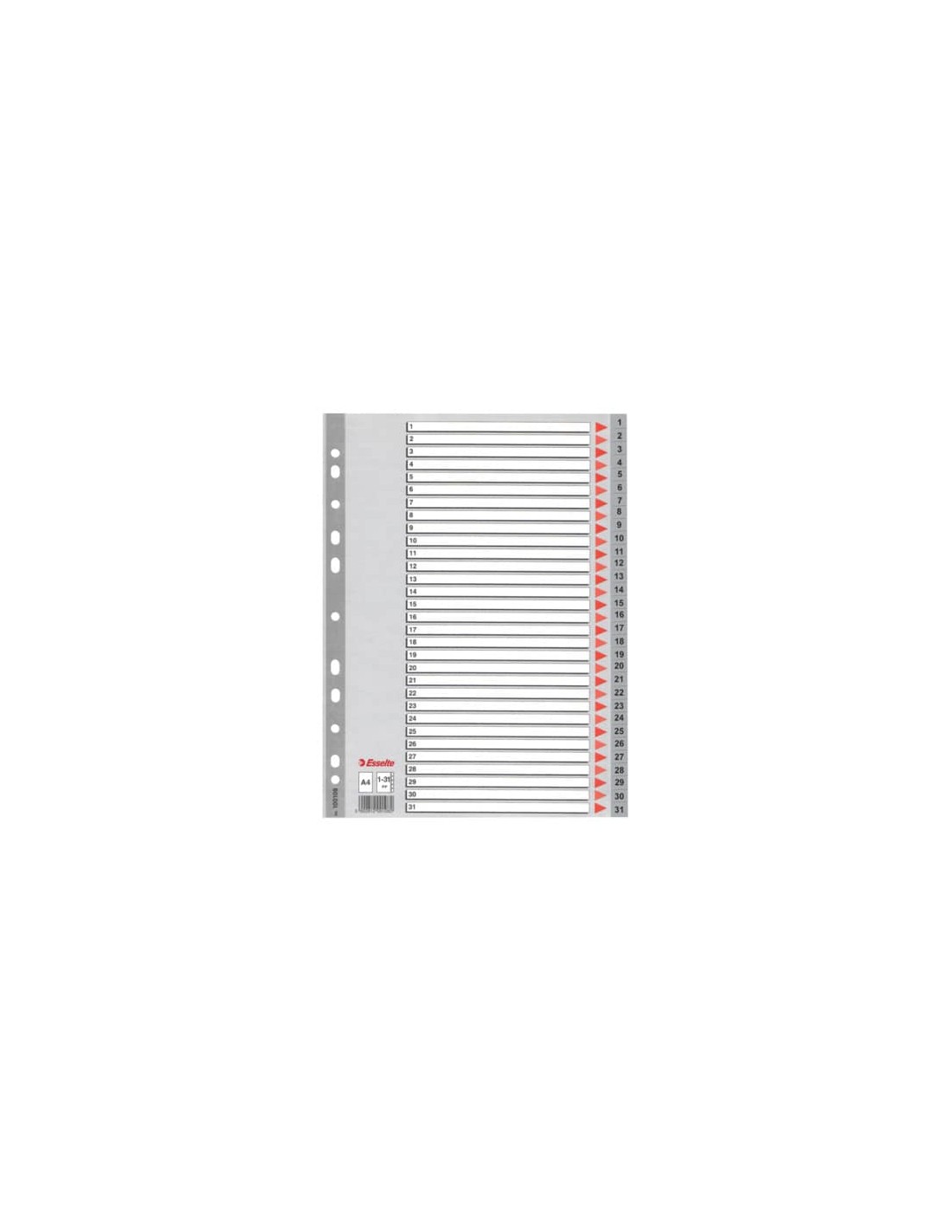 Pagina indice in cartoncino e divisori in polipropilene da 115 μ. Tasti a scalino con i numeri stampati in nero. Rinforzi in mylar sul lato forato. Il modello Maxi consente di classificare documenti contenuti in buste a perforazione universale. Tasti numerici da 1 a 31. PP. Formato A4. Grigio.