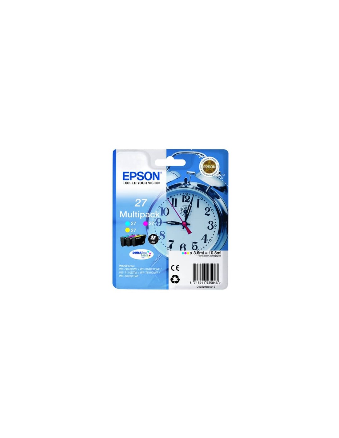 Epson 27 MultiPack, 3-pack, 10.8 ml. Colori : giallo, ciano e magenta - original. Tecnologia di stampa: Ink-jet. Compatibile con WorkForce WF-3620, WF-3640, WF-7110, WF-7210, WF-7610, WF-7620, WF-7710, WF-7715, WF-7720. Contenuto: 1 x cartuccia d'inchiostro (ciano) 3. 6 ml, fino a 300 pagine - 1 x cartuccia d'inchiostro (magenta) 3. 6 ml, fino a 300 pagine - 1 x cartuccia d'inchiostro (giallo) 3. 6 ml, fino a 300 pagine.