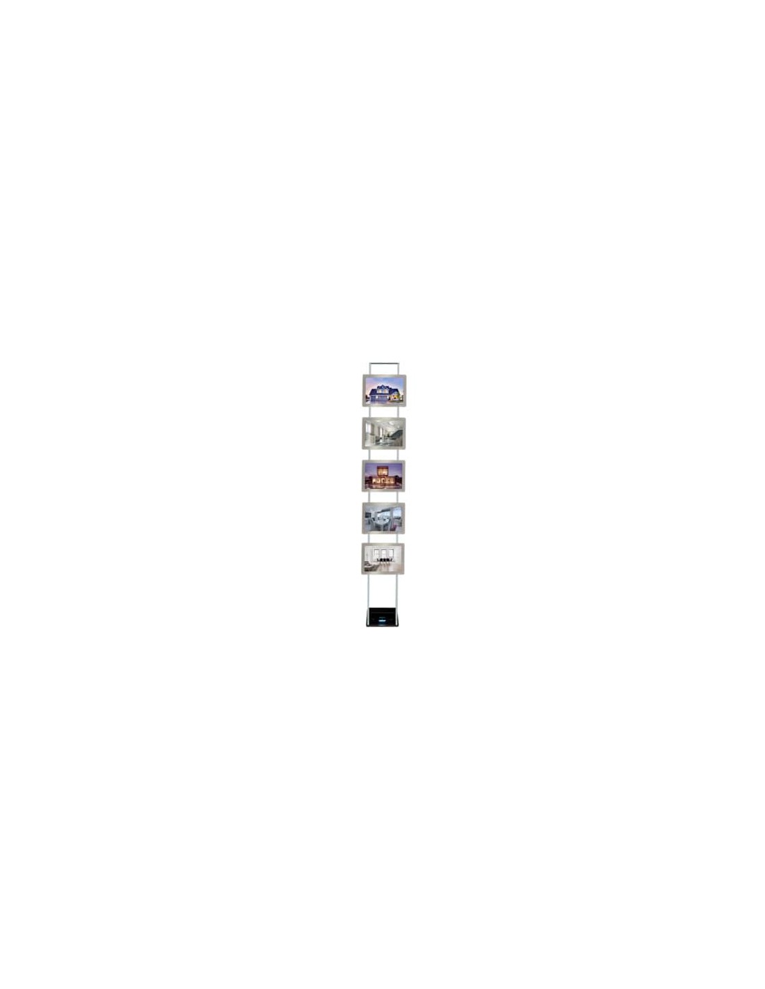 Elegante struttura autoportante in acciaio cromato con 5 cornici magnetiche formato A4 retroilluminate a led. Il concetto che contraddistingue questo prodotto è la libertà da ogni tipo di installazione a muro, con cavi o su binari. Per effetto di magneti sul retro, la cornice, calamitata alla struttura, si accende istantaneamente. Le cornici possono essere posizionate sulla struttura sia verticalmente che orizzontalmente su entrambi i lati della struttura per aumentare il numero dei messaggi esposti. Le immagini da inserire all’interno delle cornici sono facilmente sostituibili rimuovendo e riposizionando l’accessorio magnetico in dotazione. Struttura in acciaio cromato Easy LEDMAG 25x40x200 cm. Cornice magnetica LEDMAG formato A4 orizzontale/verticale 34x25 cm. Trasformatore da 50w 24v.