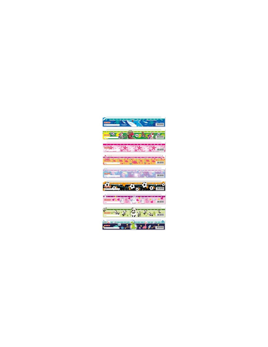 Espositore composto da 45 righelli lunghi 16 cm con decori fantasy assortiti. I righelli hanno smusso e bordo tirachina. La millimetratura e il decoro sono in digitale.