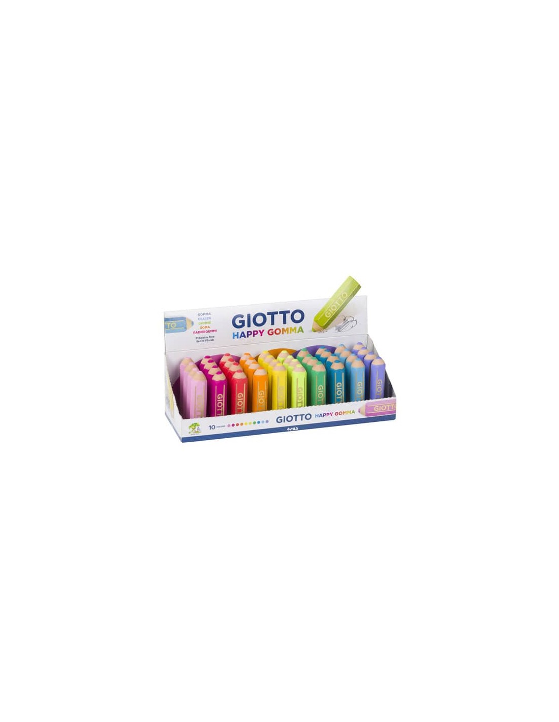 La coloratissima gomma a forma di matita Giotto. Comoda per l'astuccio, sicura, senza ftalati e senza PVC. Disponibile in 10 colori arcolabeno: rosa, fucsia, corallo, arancione, giallo, verde mela, verde prato, azzurro, blu, lilla. Espositore da banco da 40 pezzi assortiti.