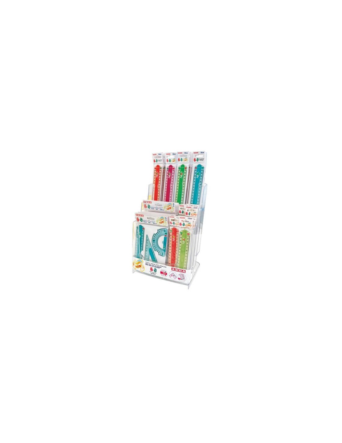Espositore composto da 15 mini-set contenenti: 1 riga da 15 cm, 1 squadra 60° x 15 cm, 1 goniometro 180°x10 cm; 15 righe da 15 cm; 15 righe da 30 cm. Arda Left&Right è una linea dalla doppia gradazione pensata appositamente per destrimani e mancini.