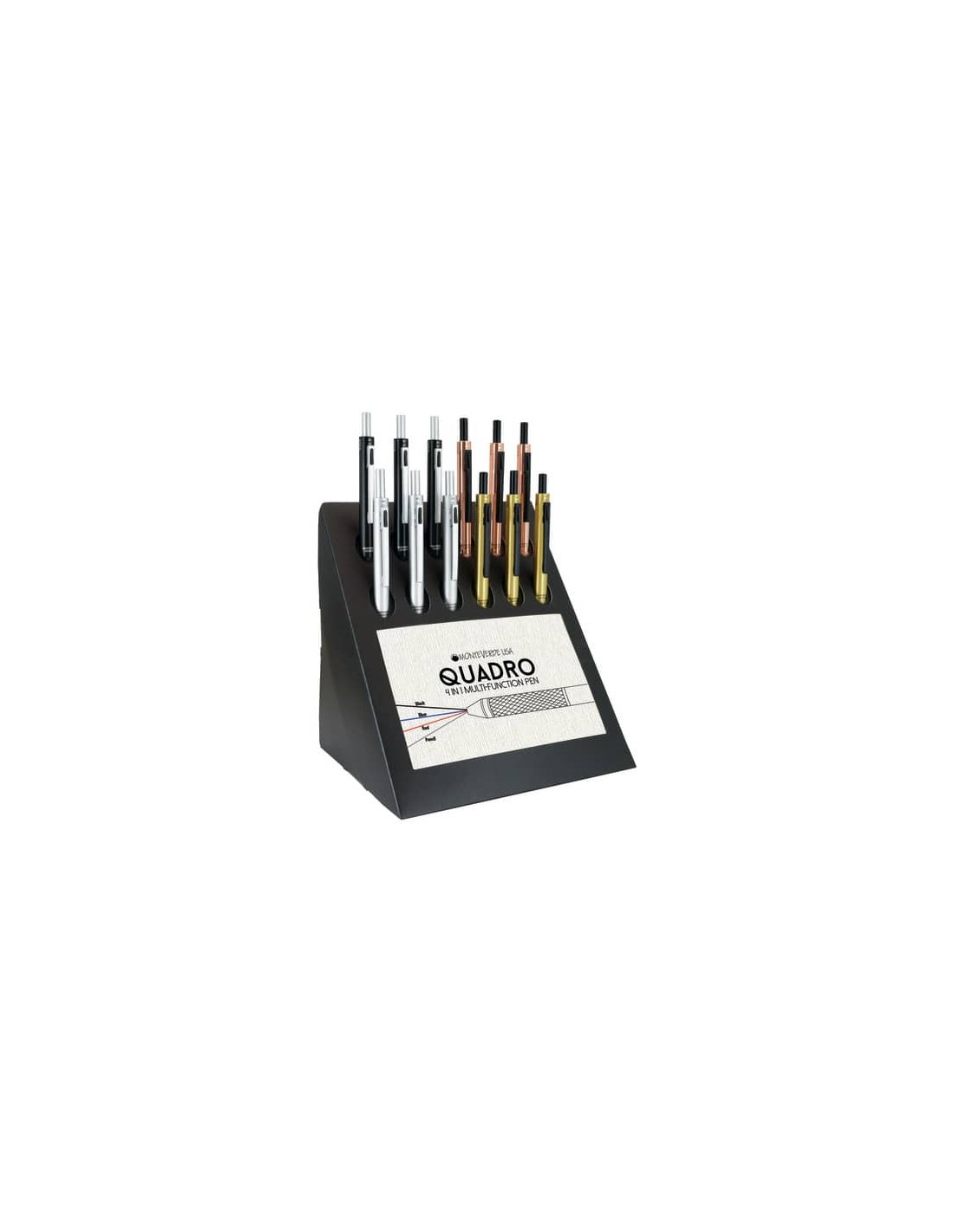 Espositore 12 penne multifunzione 4 in 1. Penna a sfera a scatto in 3 colori differenti e portamine 0.5. Dotata di meccanismo di gravità assistita che permette di cambiare la funzione semplicemente impugnando la penna e ruotandola in corrispondenza delle modalità di scrittura desiderata.
