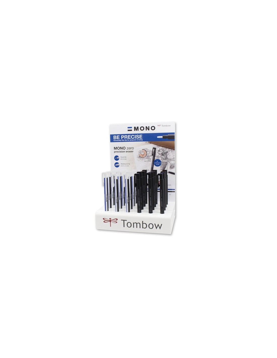 Espositore composto da 24 gomme di precisione Tombow Mono Zero con fusto nero oppure bianco a righe nera e blu. Disponibili in 2 punte: tonda con diametro 2,3 mm e rettangolare 2,5 x 5 mm. Dimensioni display da banco: 170 x 230 x 130 mm.