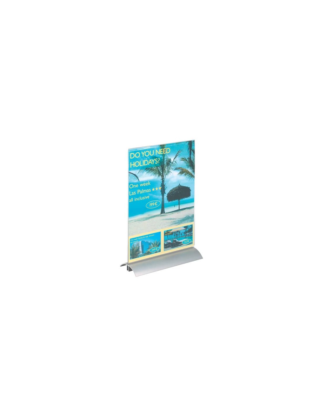 Espositore portastampati da tavolo formato A4, dal design contemporaneo. Realizzato con pannello in acrilico trasparente crystal-clear e base in alluminio di alta qualità. L'inserimento del pannello nella base risulta facile e veloce grazie al sistema di bloccaggio che, unico nel suo genere, lo trattiene saldamente in posizione e ne permette la rimozione semplicemente facendolo scorrere nella guida presente sulla base. L'inserto potrà essere sostituito senza dover rimuovere il pannello. Leggibile da entrambi i lati.